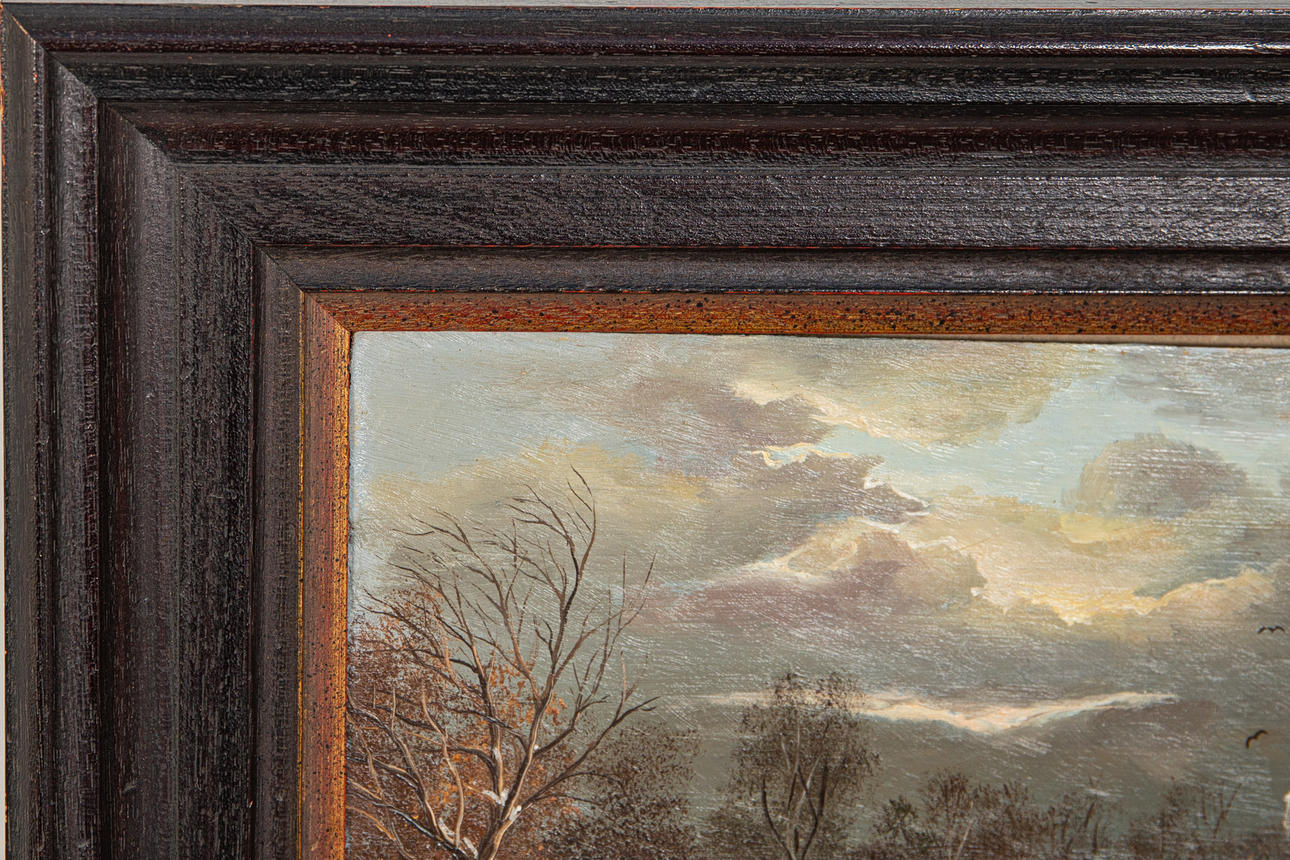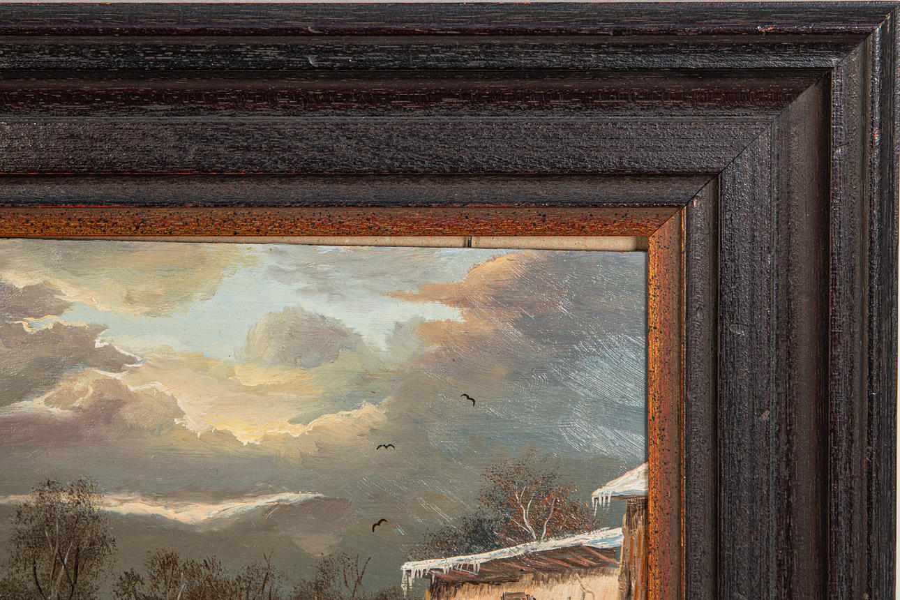 H. Bachmann, painting, winter landscape, oil on panel. Representation of a wintry exterior with a building on the right in front of a cloudy sky, signed lower left, 24x29cm (38.5x44.5cm).