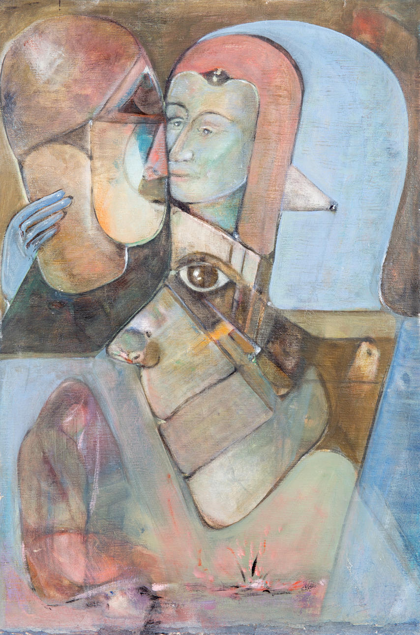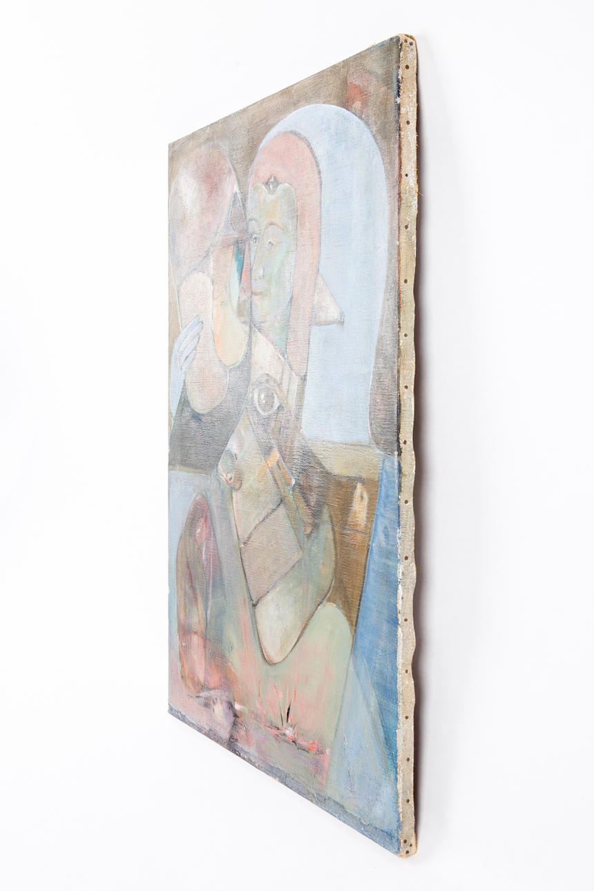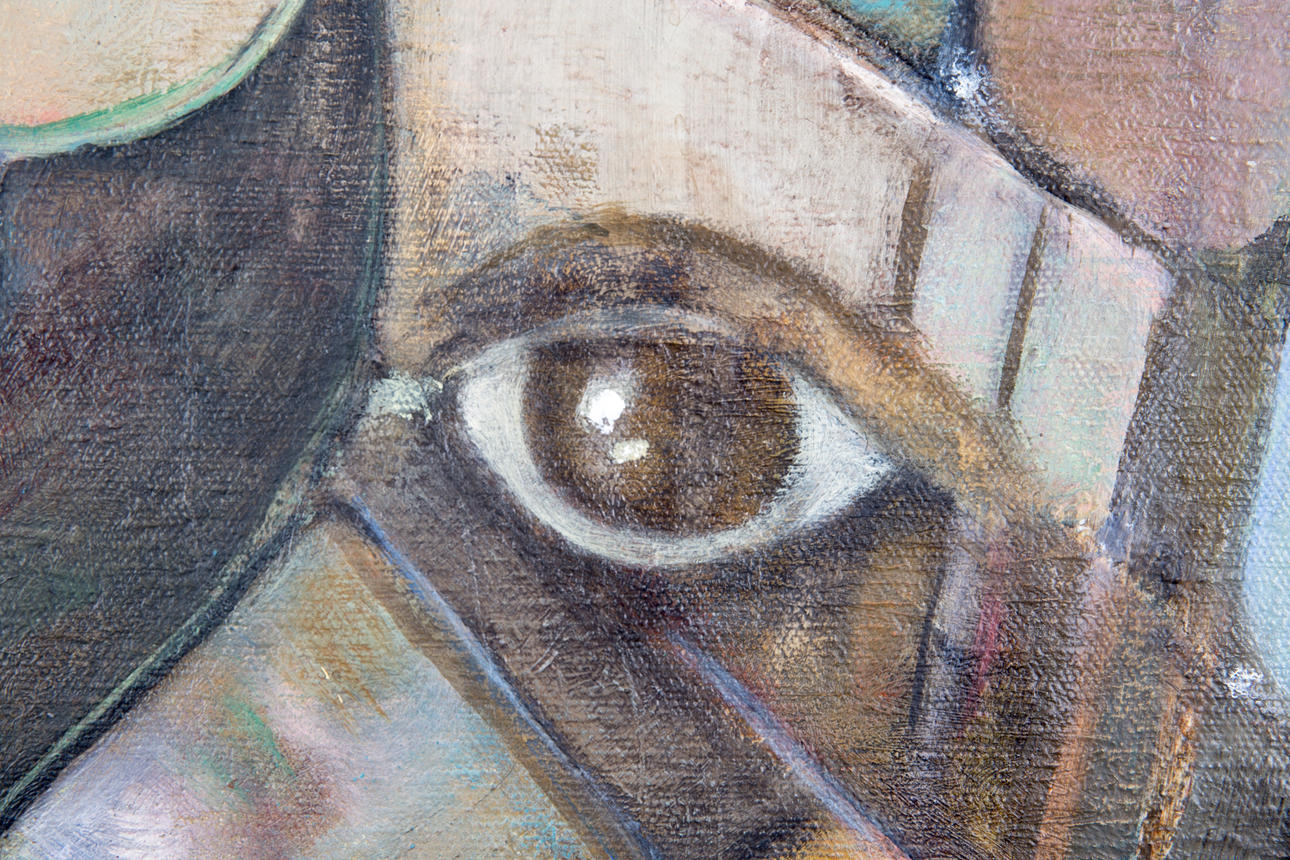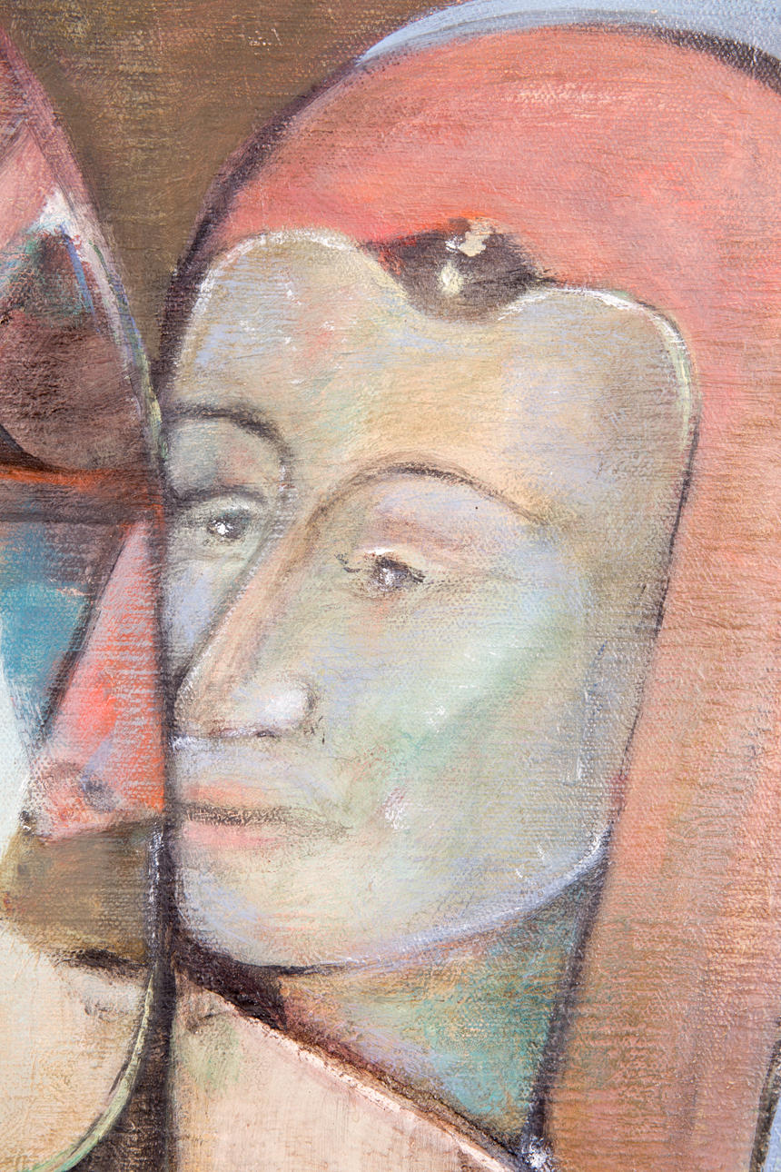 Unknown artist, painting, cubist composition, oil on canvas. Abstract composition with figurative, cubist elements in blue, brown and red, 90x61cm.