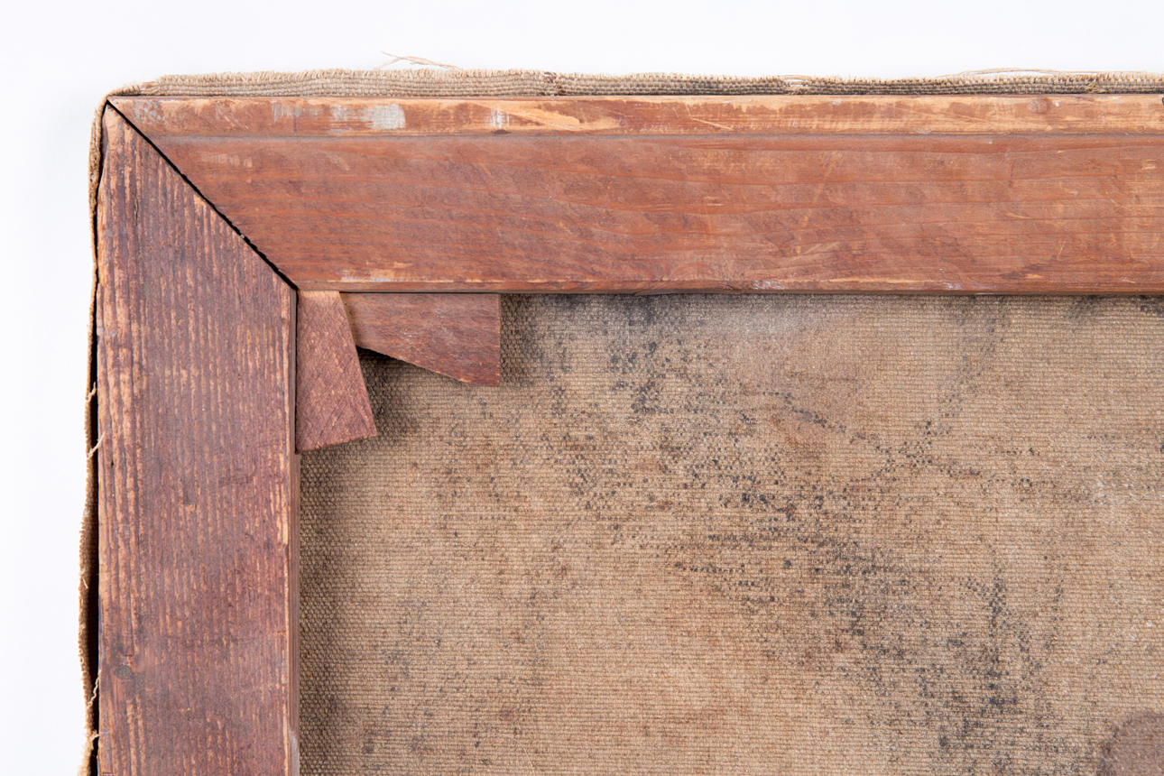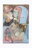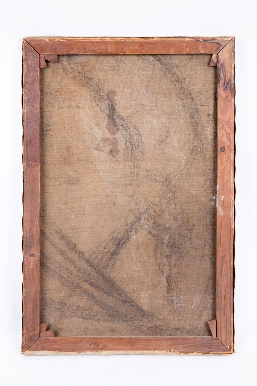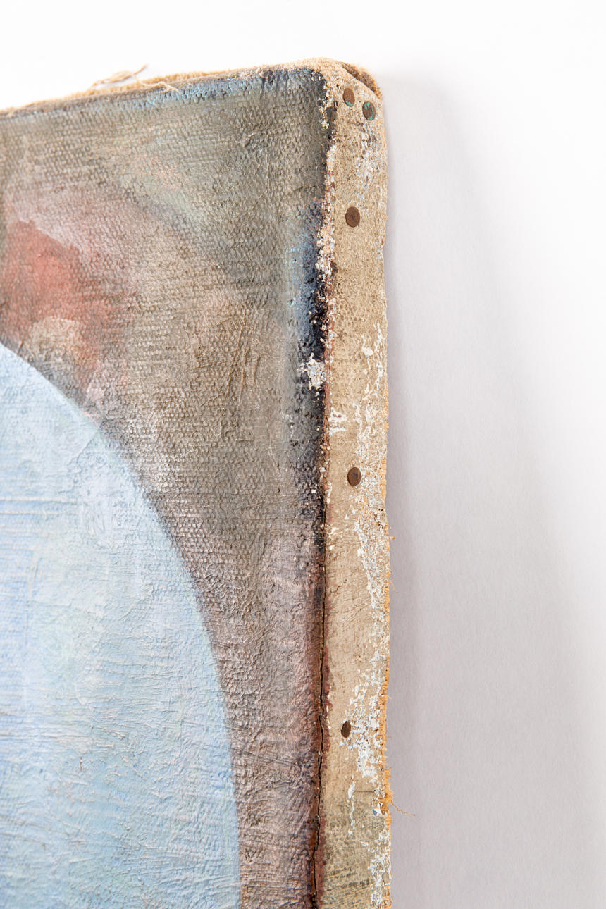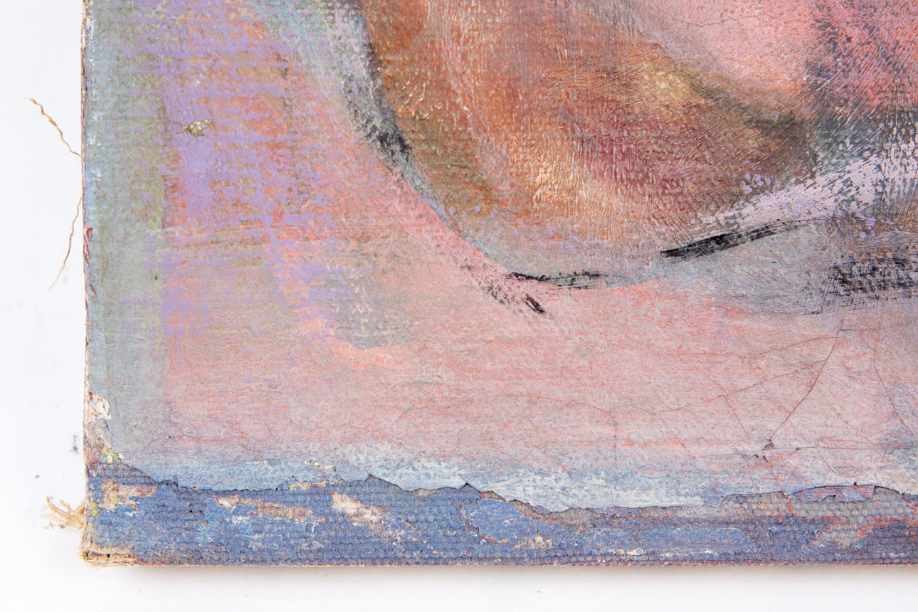 Unknown artist, painting, cubist composition, oil on canvas. Abstract composition with figurative, cubist elements in blue, brown and red, 90x61cm.