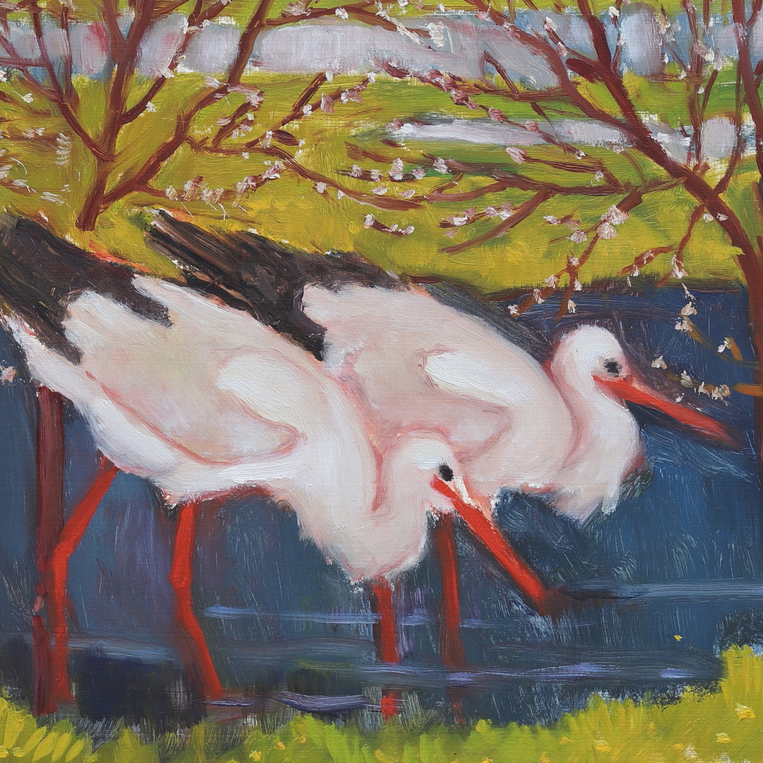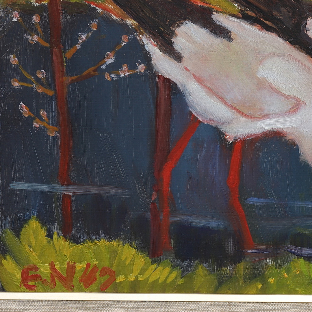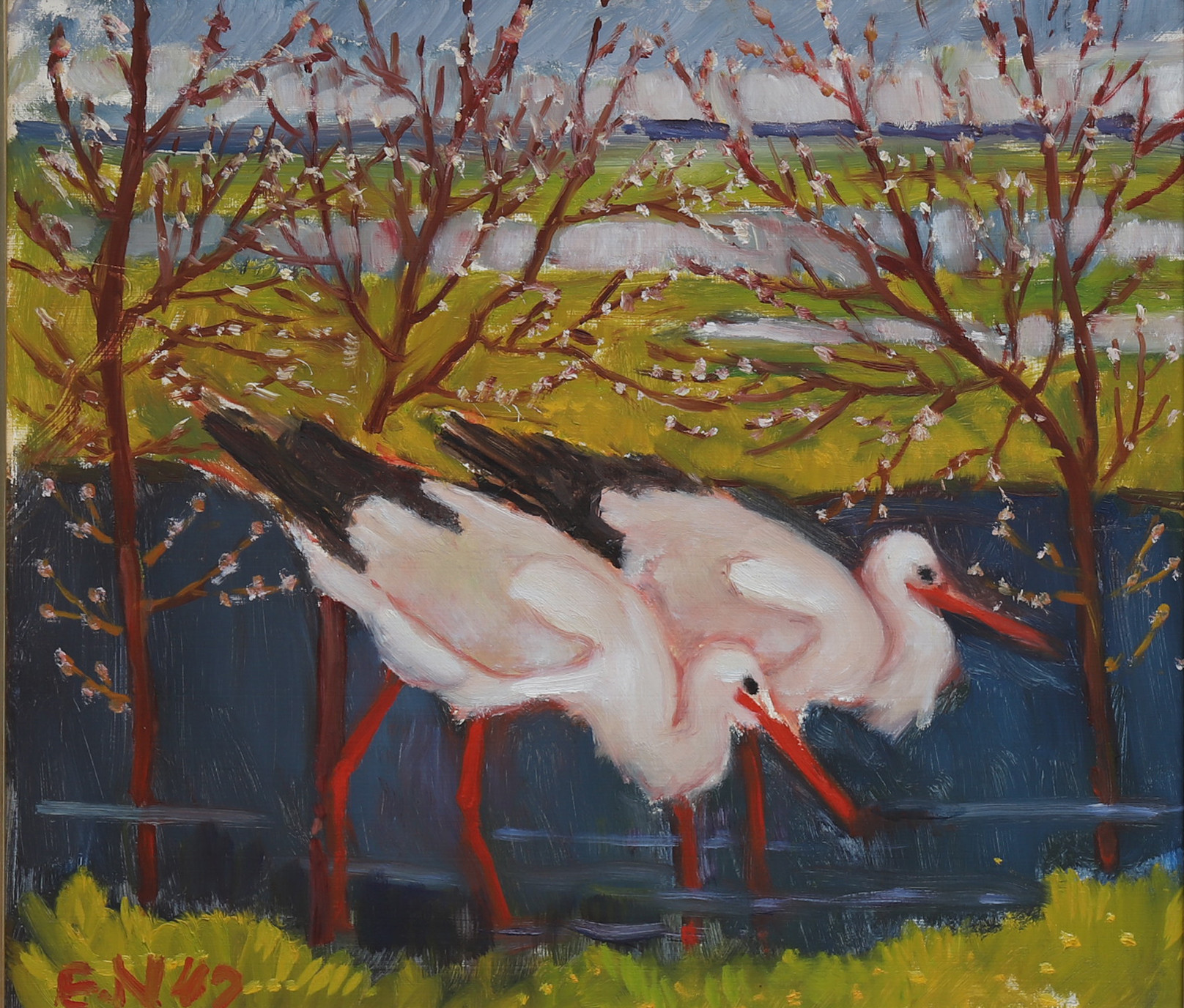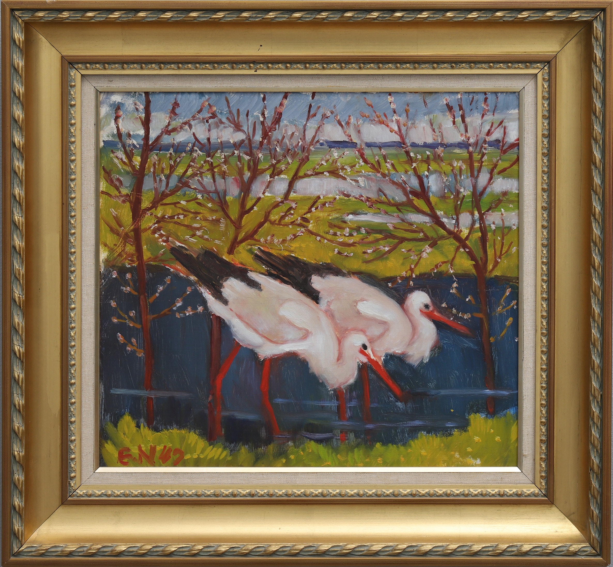 1728996. ERNST NORLIND. PAIR OF STORKS IN SPRING LANDSCAPE.