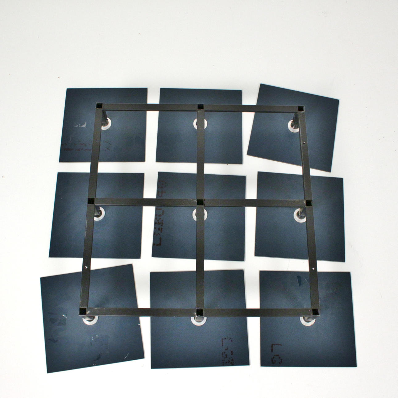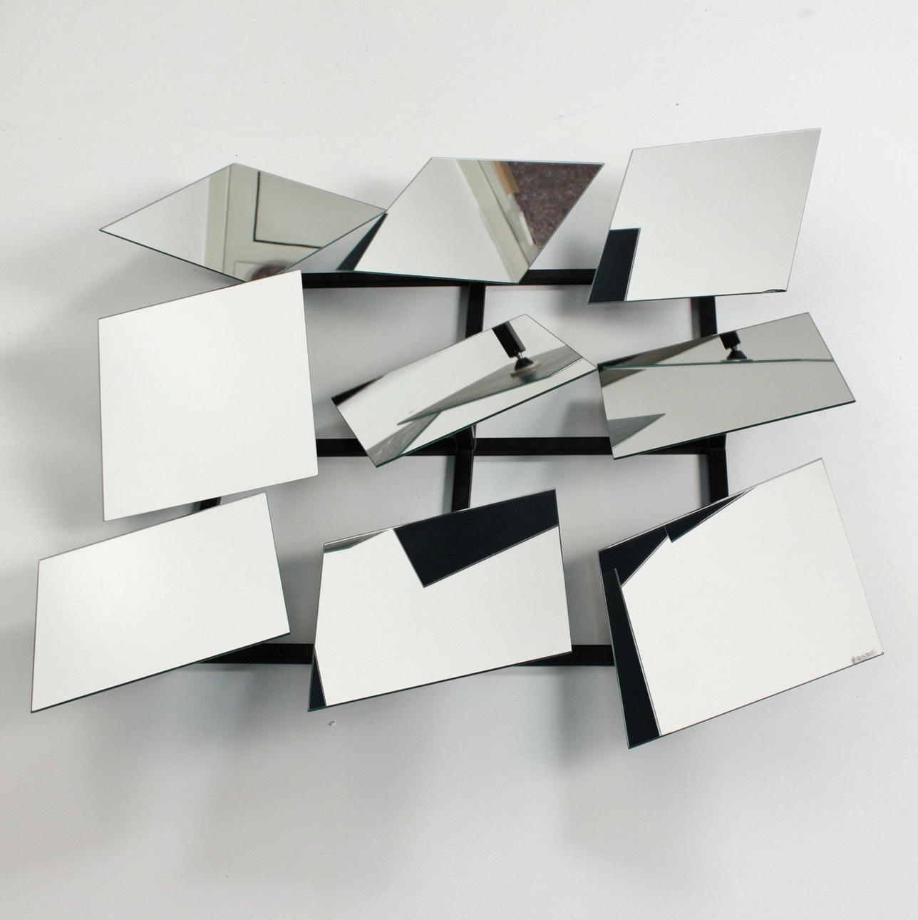 Wall-mounted mirror with a black lacquered steel frame, nine ball-jointed, square mirror elements. Draft from 1985. Marked with label. dimensions approx. H.81cm, W.81cm, D.11cm.