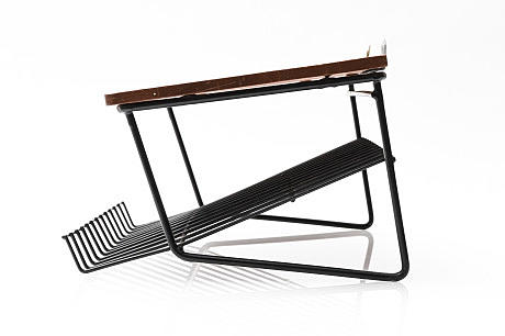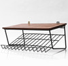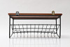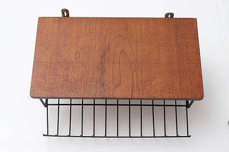 Telephone shelf, 1960s/70s, for wall mounting, stained wooden board, sloping shelf in blackened metal wire, length approx. 47.5 cm, depth approx. 34 cm, height approx. 22 cm.