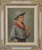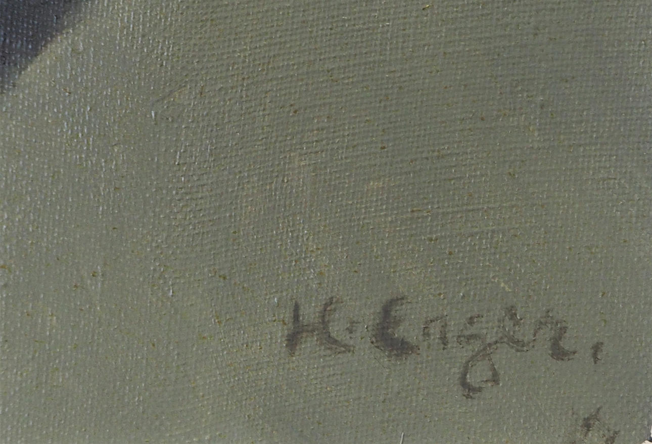 Exhibition label attached to the back of canvas, slightly visible in side light. Frame with wear.