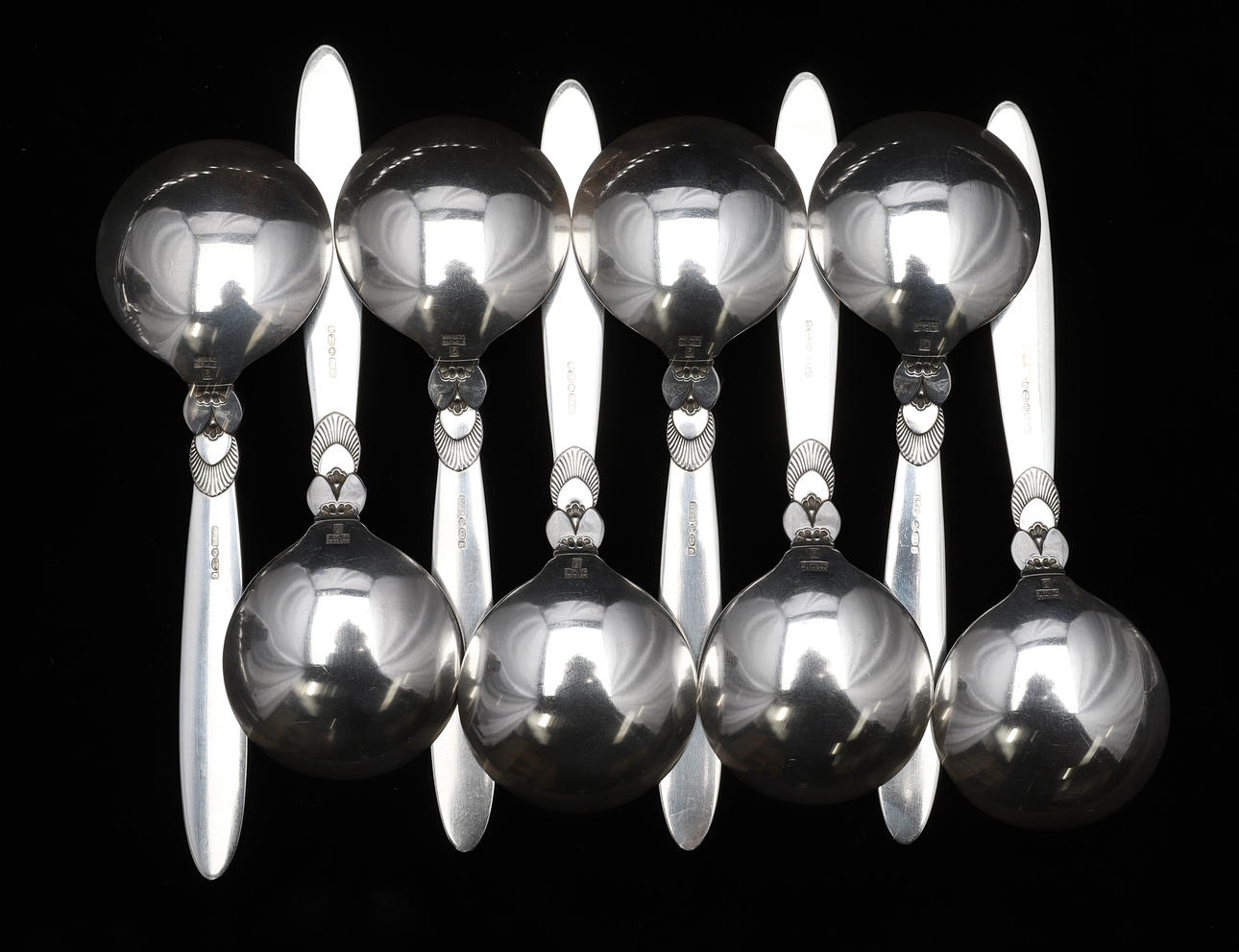 8 soup spoons, maker’s marks, 6 with import marks for London 1936, 1 for 1934, 1 for 1935,