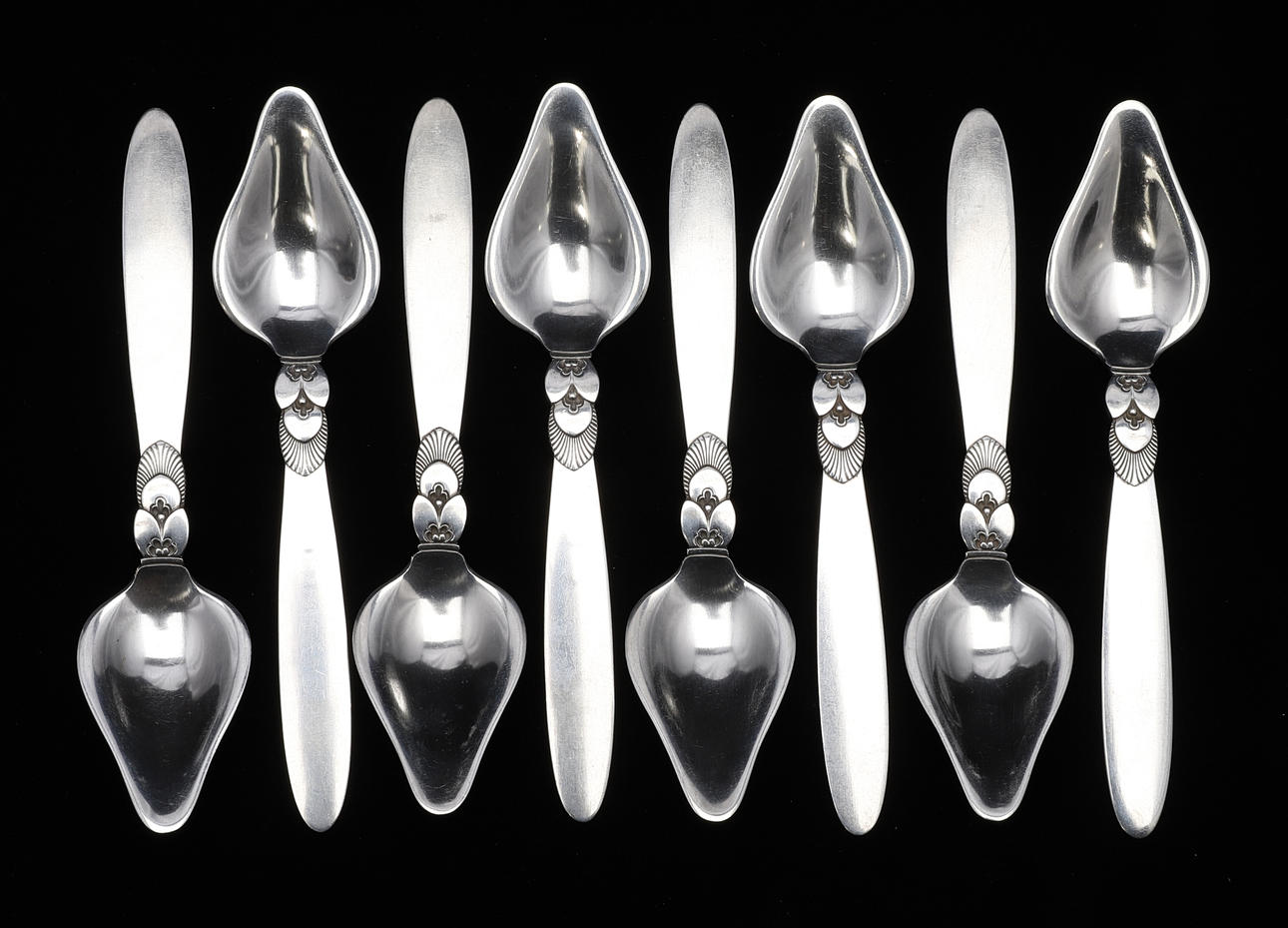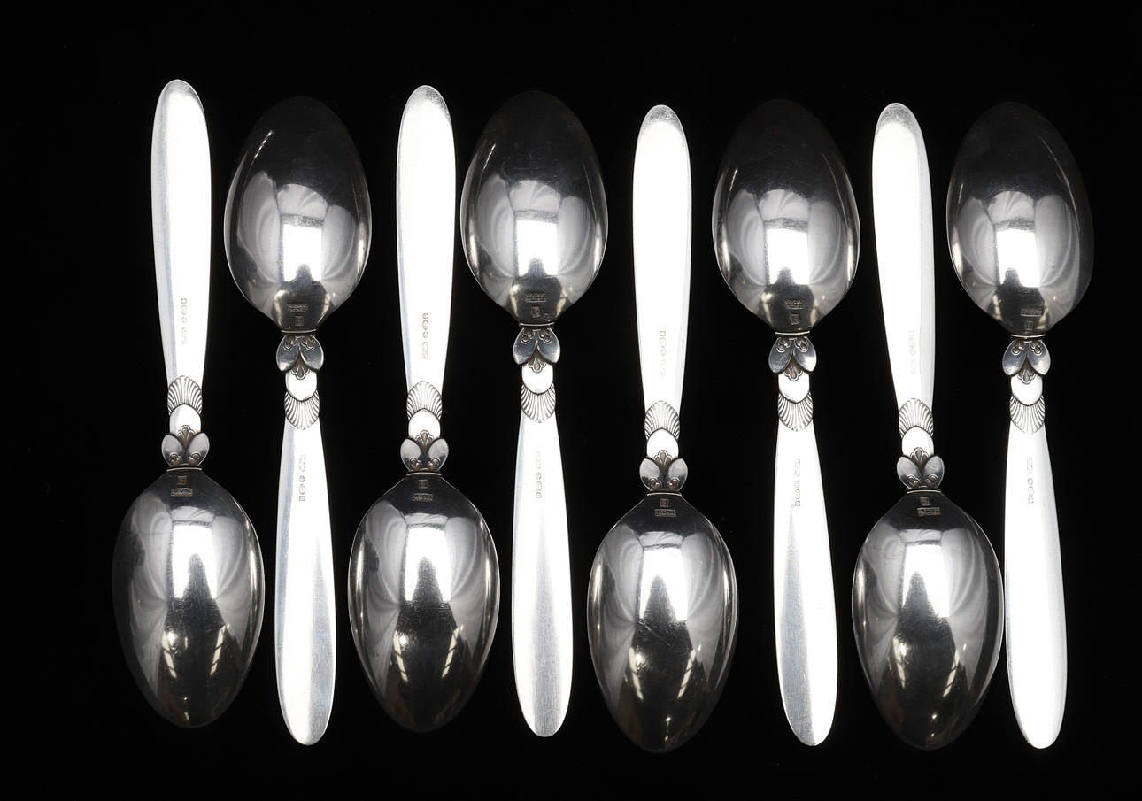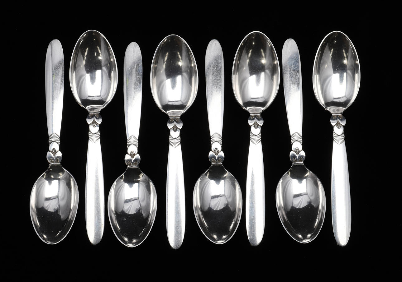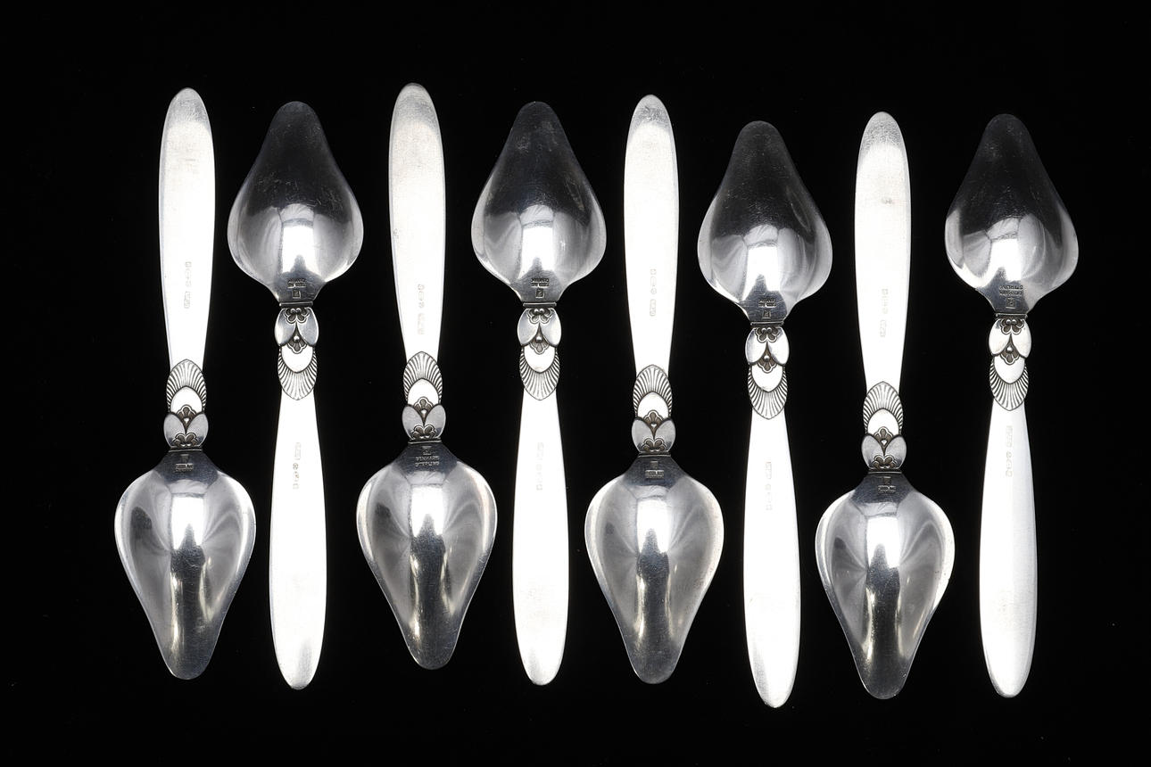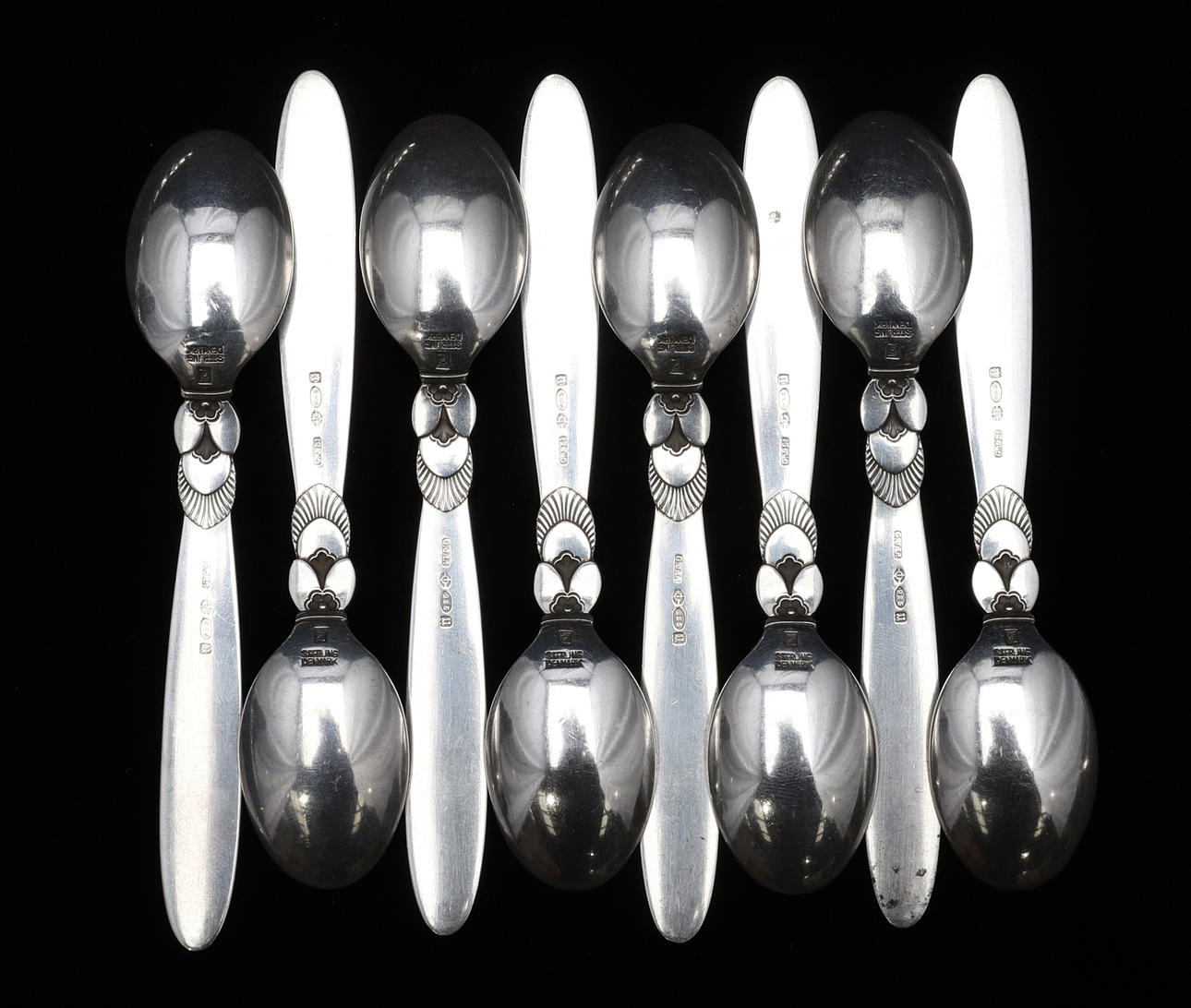 8 coffee spoons, maker’s marks, import marks for London 1935, 9.5cm long,