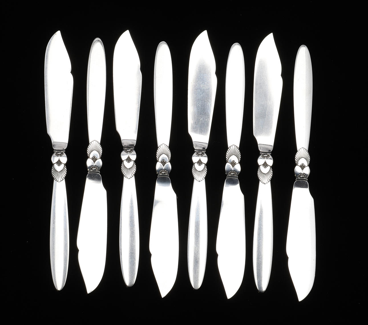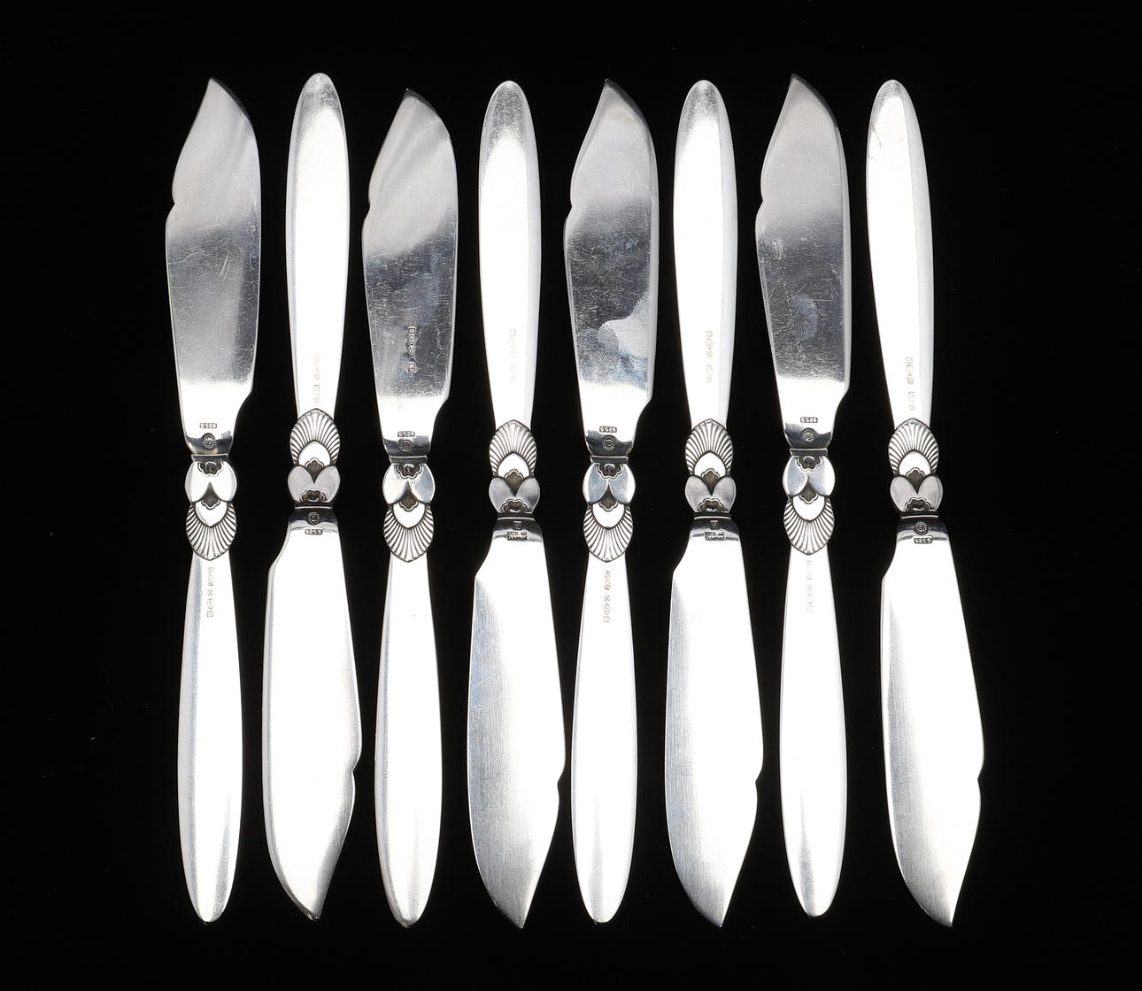 8 fish knives, maker’s marks, 6 with import marks for London 1931, 2 for 1935, 19.5cm,