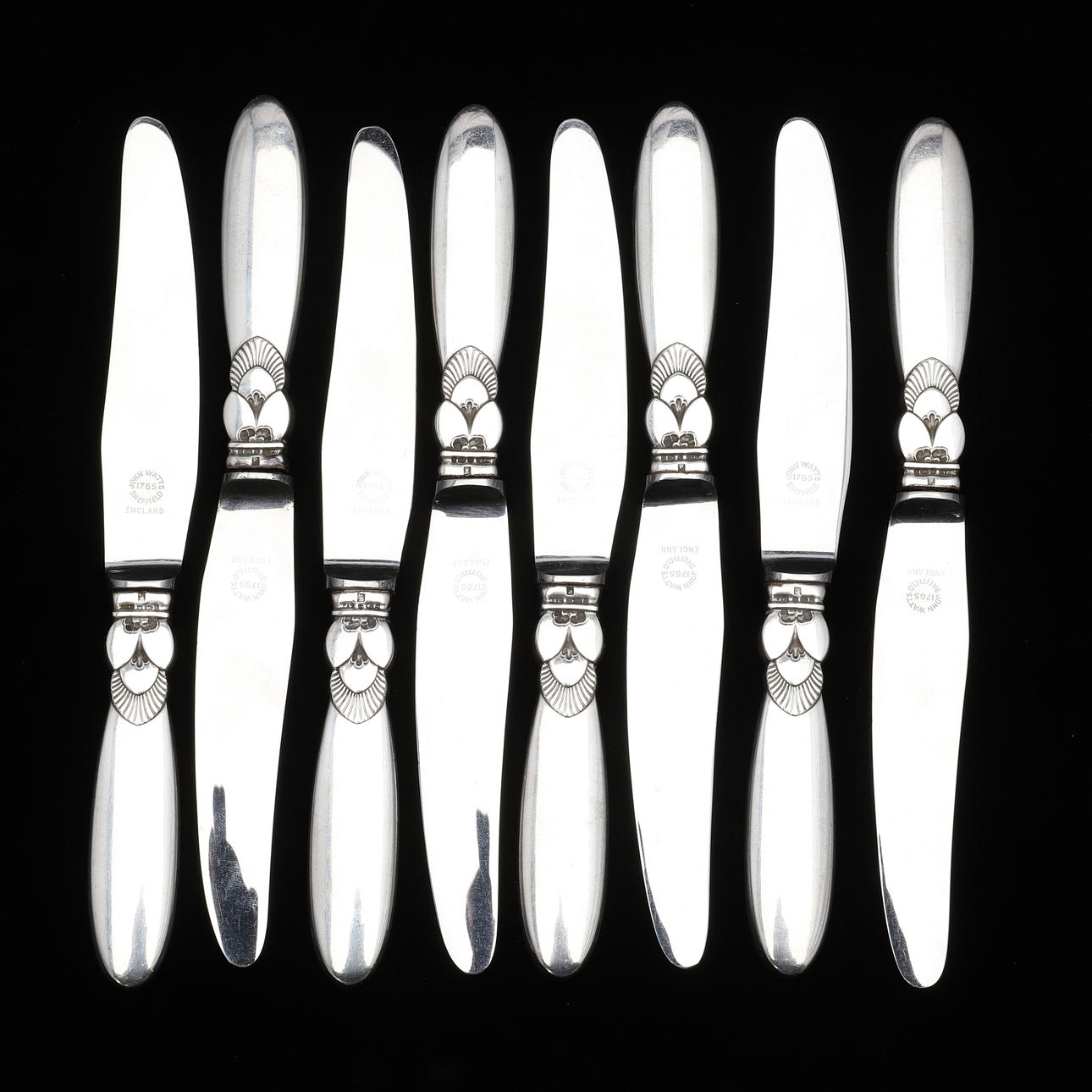 8 dinner knives with stainless blades, maker’s marks, 6 with import marks for London 1934, 2 for 1936, 25cm,