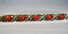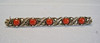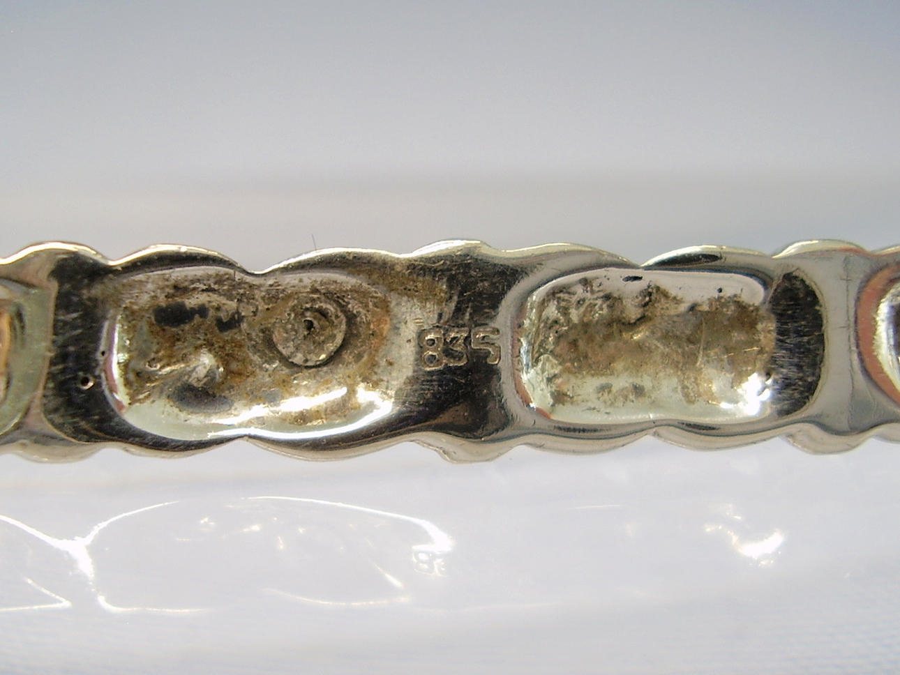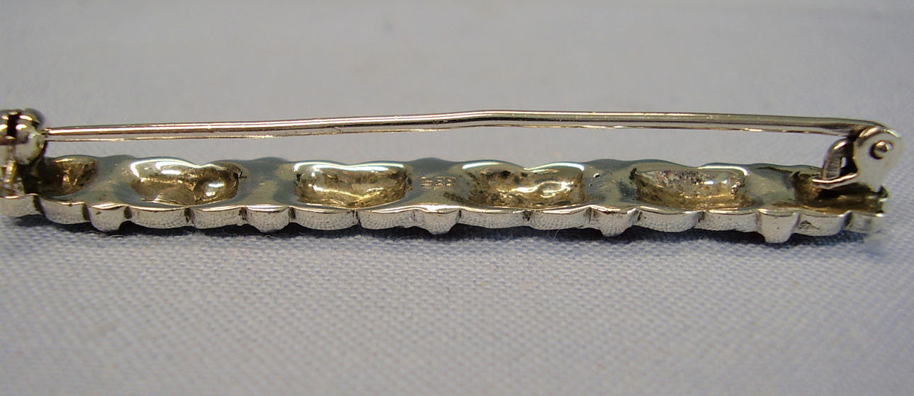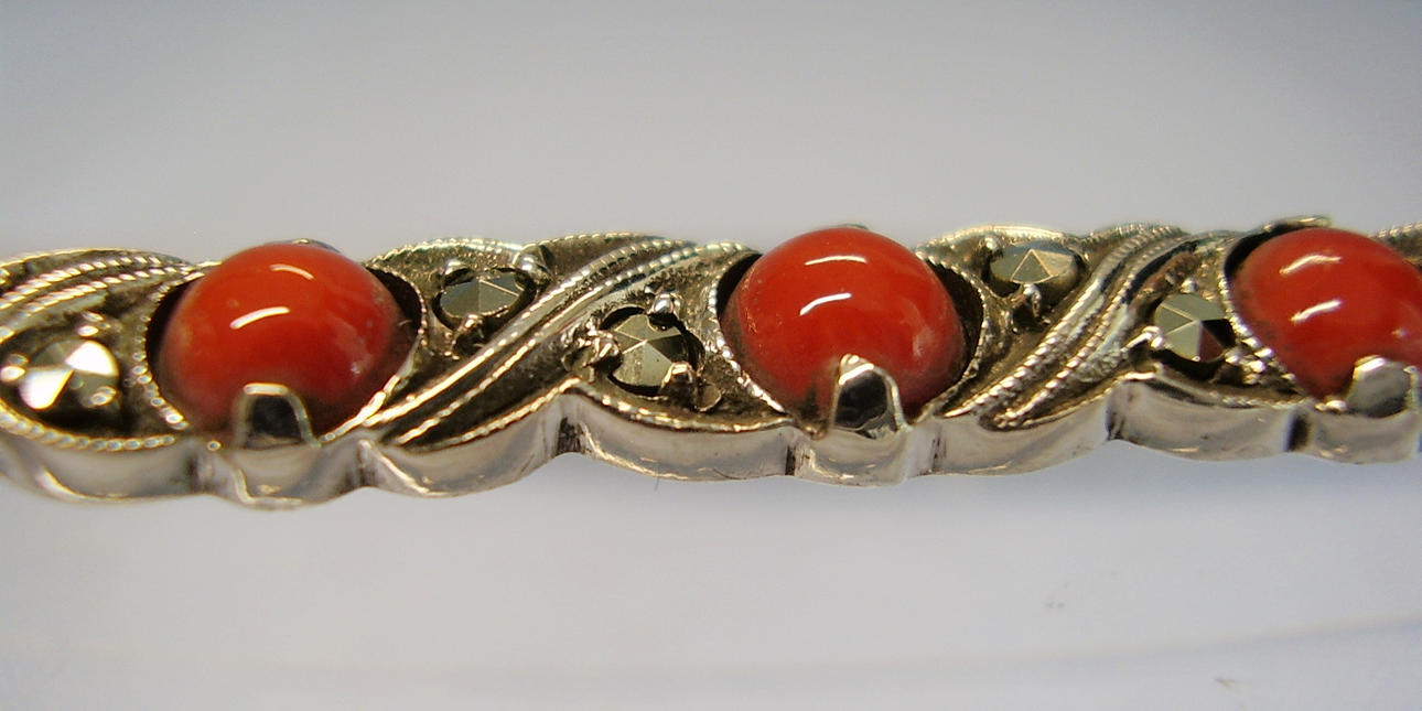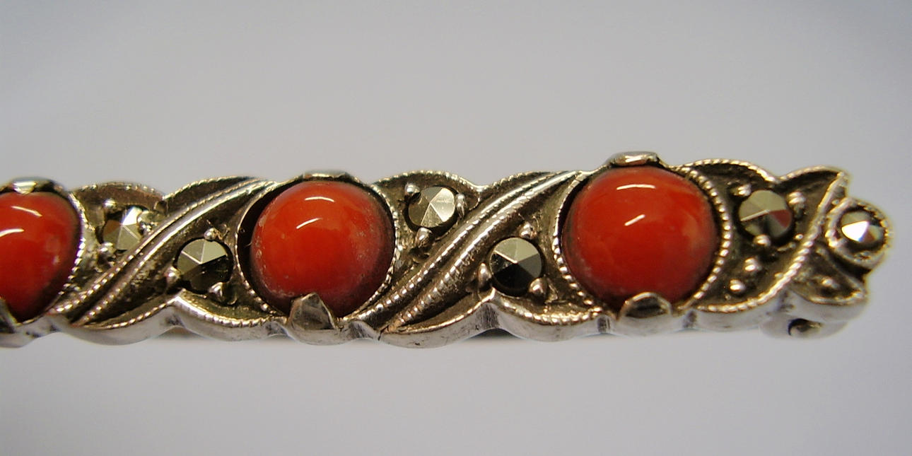 It is designed as a bar brooch and carries 5 salmon-red, natural Sardegna coral boutons. The corals are arranged alternately with crossed bands set with marcasites.