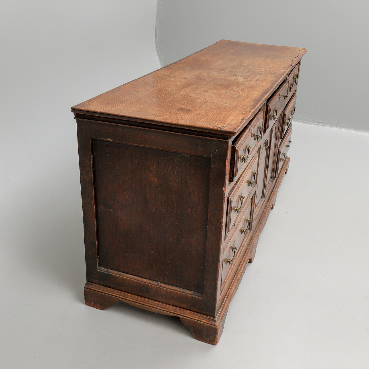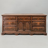 of panelled construction, the rectangular top above three raised moulded front drawers with four further drawers below, flanking a central cupboard enclosed by a pair of arched panel doors, on a shaped apron stand, 184cm wide x 57cm deep x 85cm high