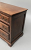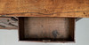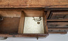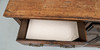 Knocked, marked, scratched and stained, uneven colour consistent with age and use, top of paler colour and with splits, signs of where previous handles have been, locks replaced, later divisions to the middle drawer.