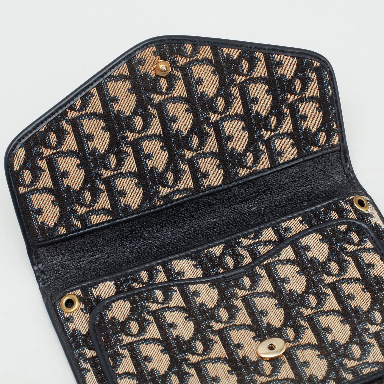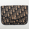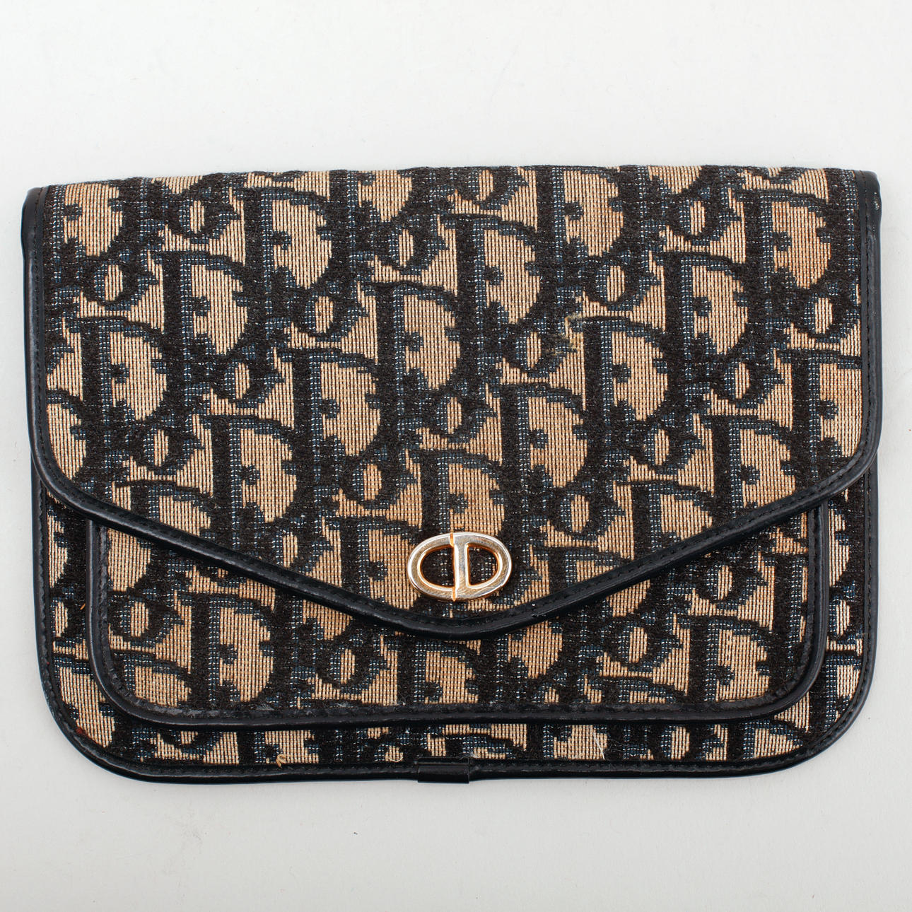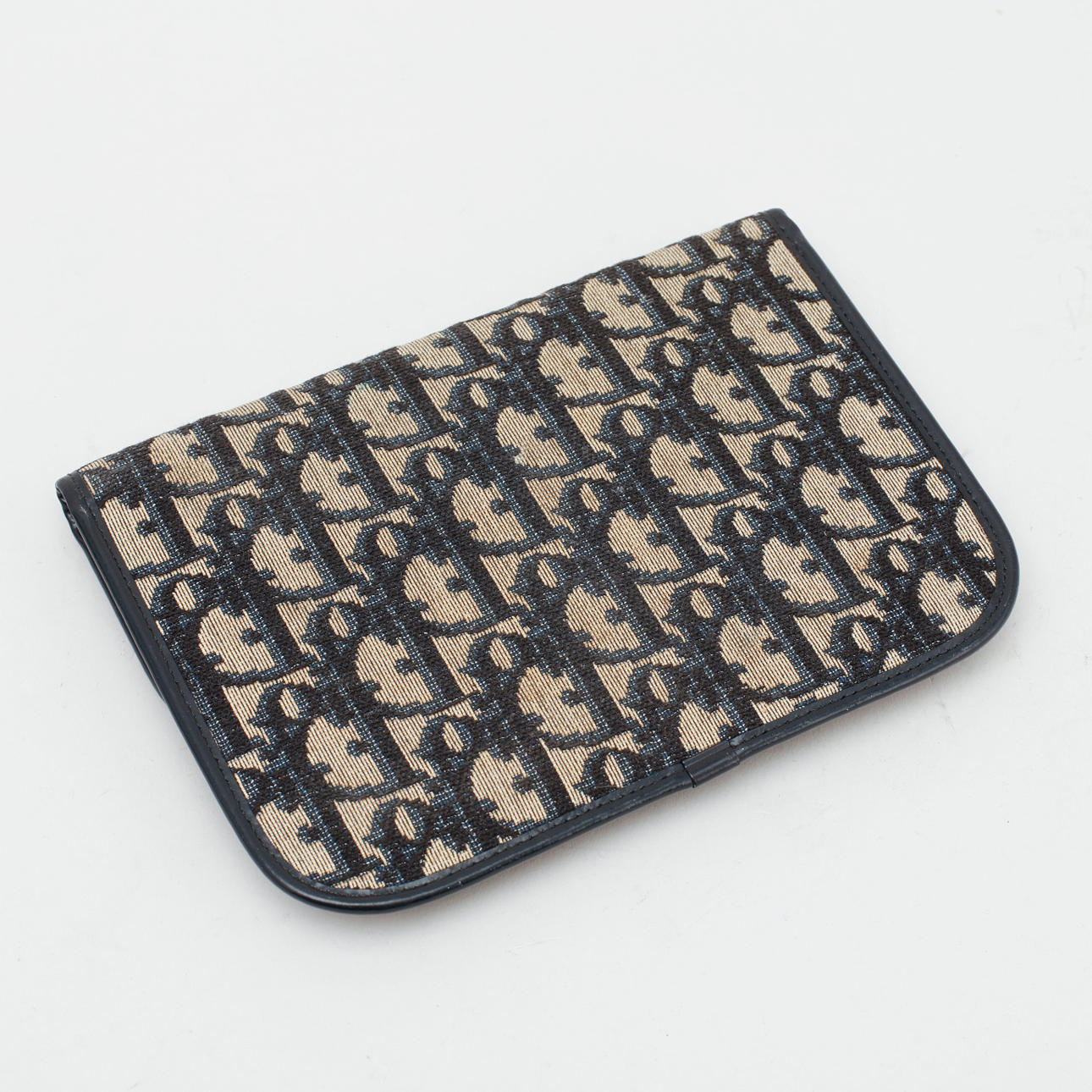 Bag: Clutch in monogram canvas with blue details. CD logo in gold metal. Inside marked "Christian Dior MADE IN FRANCE". About 19 x 13 cm.