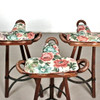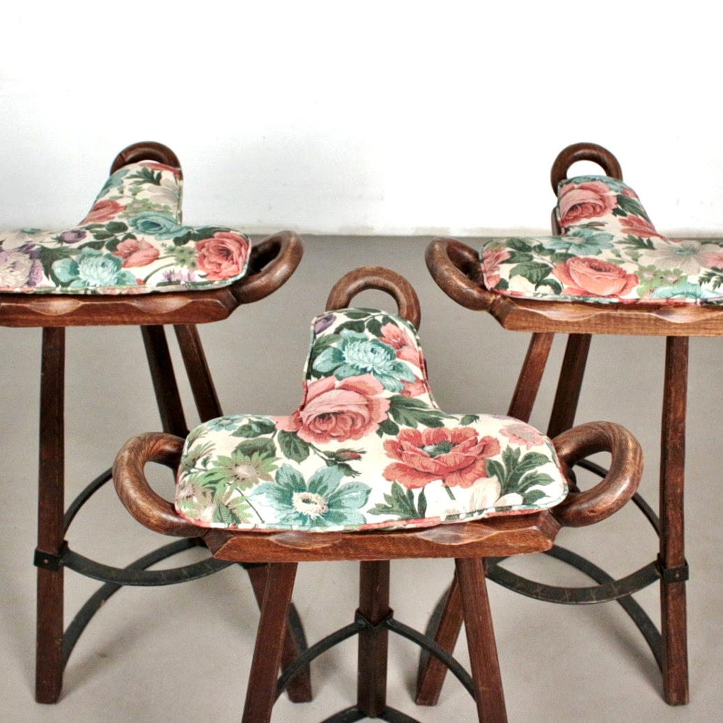 Set of three bar stools, probably Spanish design: Marbella model. Three-legged construction made of solid, stained wood, footrest and base made of steel band, seat cushions made of floral patterned fabric fastened with Velcro. dimensions approx. H: 85 cm, W. 48 cm, D. 43 cm.