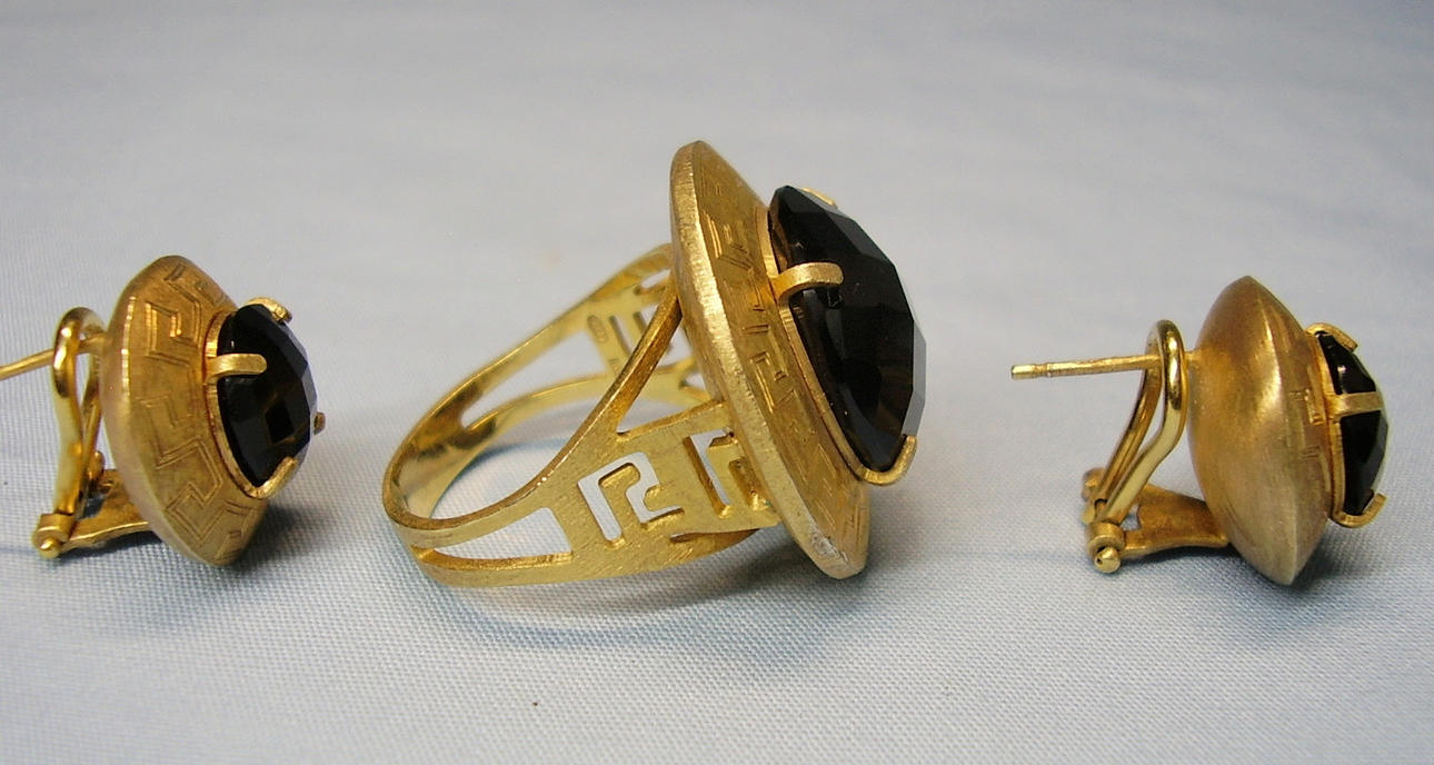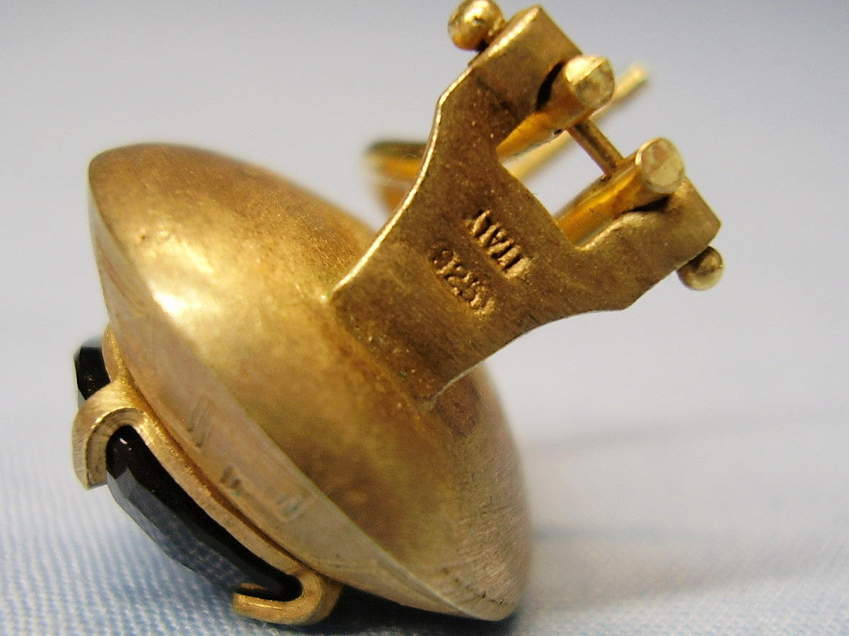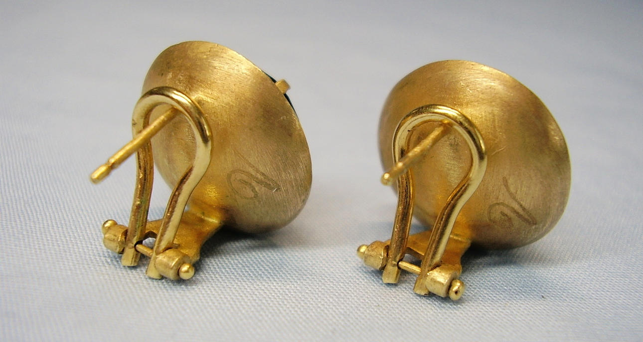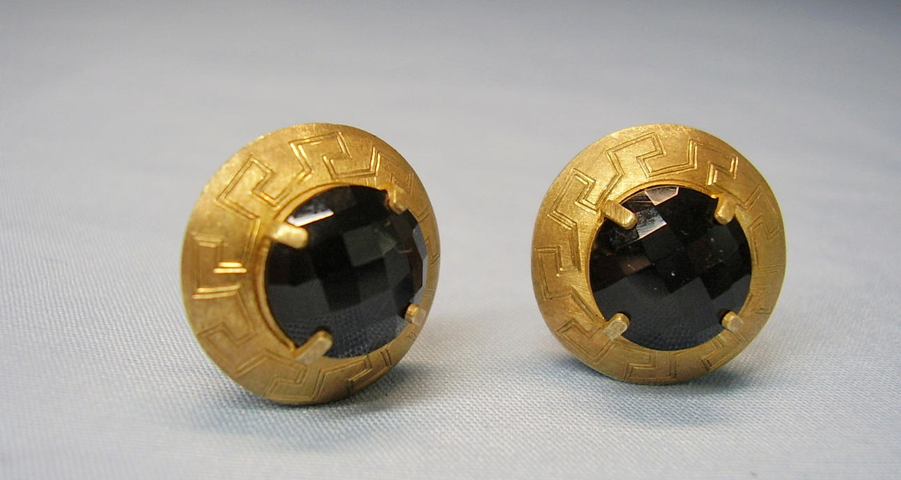 The ear studs are also set with round faceted black spinels, with a meander edge and an omega clip on the back for a better hold.