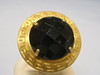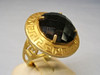 The ring is set with a round faceted, black spinel surrounded by a wide decorative setting with a faceted meander pattern, which can also be found on the ring shoulders Ring head 24.3 mm in diameter, spinel 16.2 mm in diameter (15 ct.) Ring weight 9.3 grams.