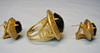 The jewelery set consists of a designer ring and matching ear studs. All three parts are made of 925 silver, hallmarked and gilded in 14 carat yellow gold. In addition, they bear the signet of Veronese, Italy.