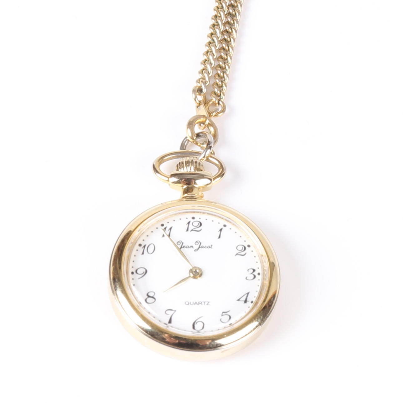 Armex pocket watch, case and link in yellow metal, manual movement Case diameter 48.5 mm Fé pocket watch, case and link in white metal, quartz movement Case diameter 44.5 mm Jean Jacot pocket watch, case and link in yellow metal, quartz movement Case diameter 28, 5 mm.