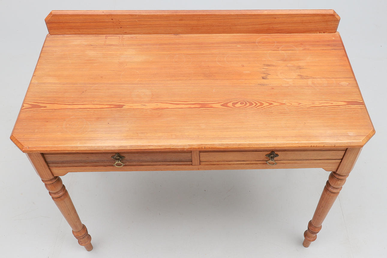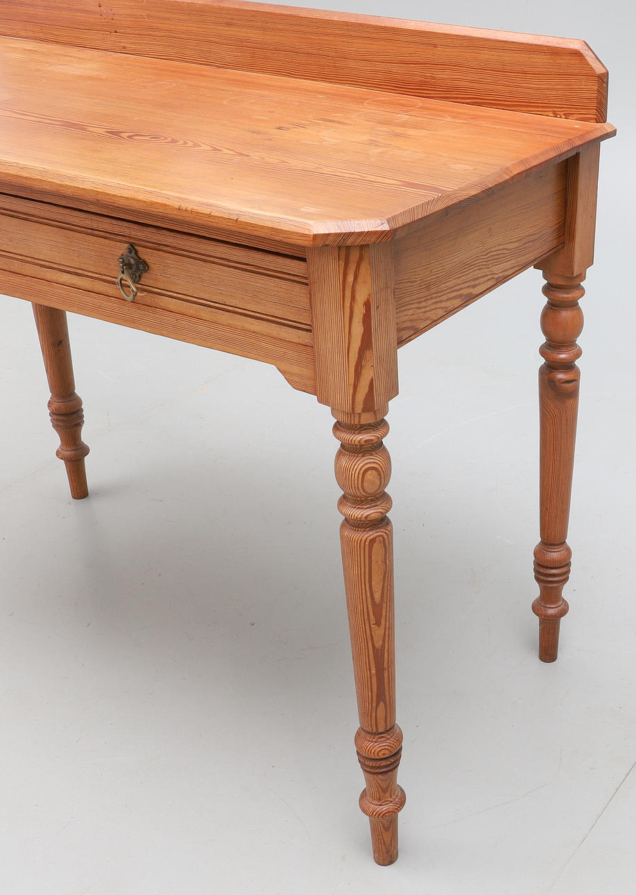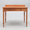with a low raised back, two frieze drawers, on turned legs, 99cm wide x 49cm deep x 83cm high.