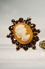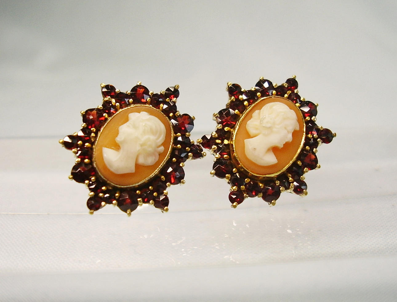 They are set with oval hand-cut shell cameos. The cameos depict portraits of women surrounded by a rosette-shaped entourage of round-faceted blood-red antique rose-cut Bohemian garnets.