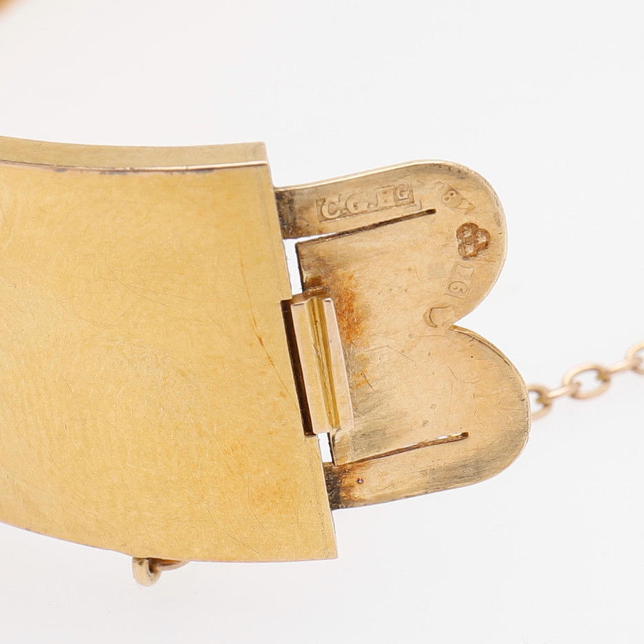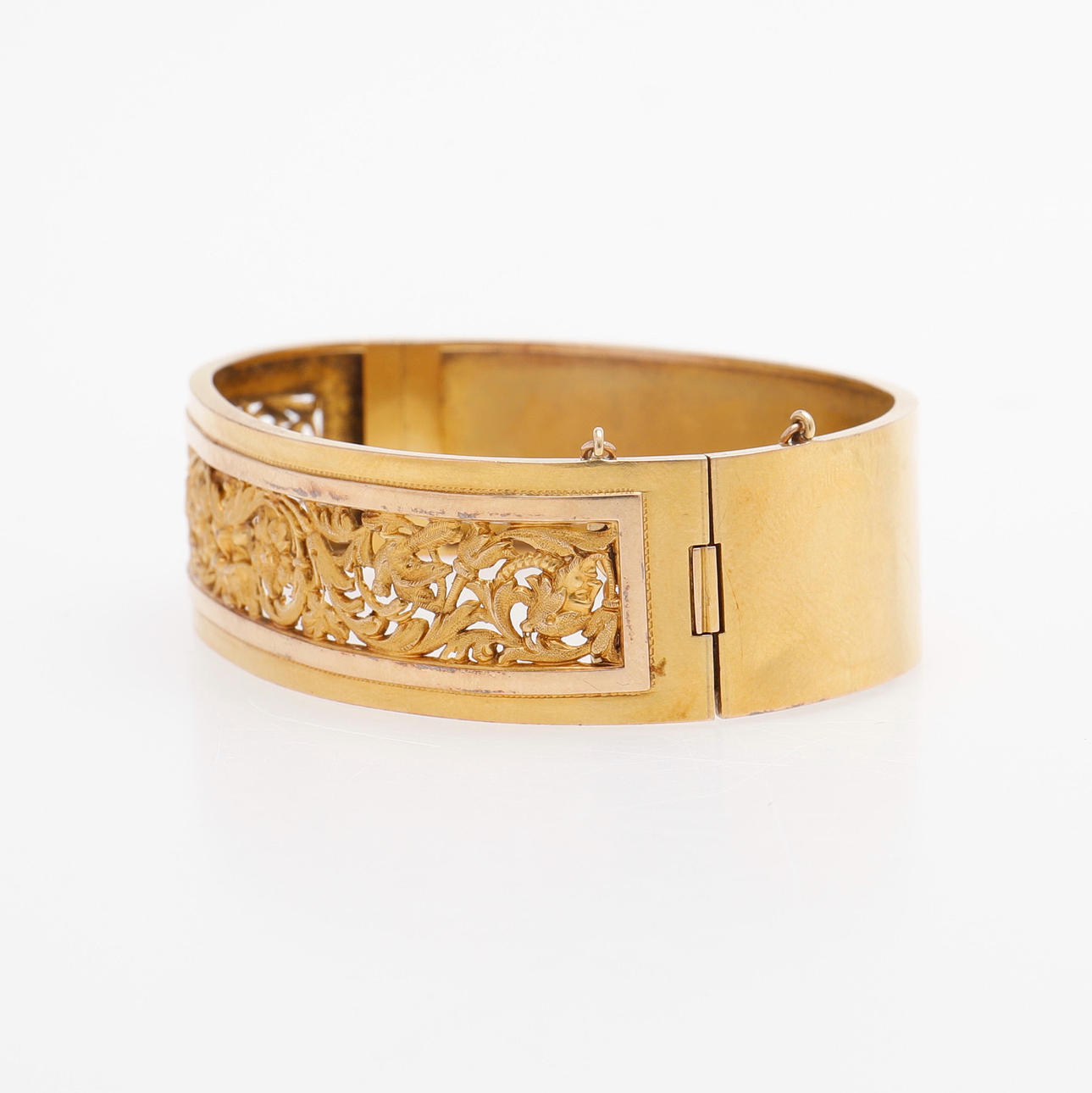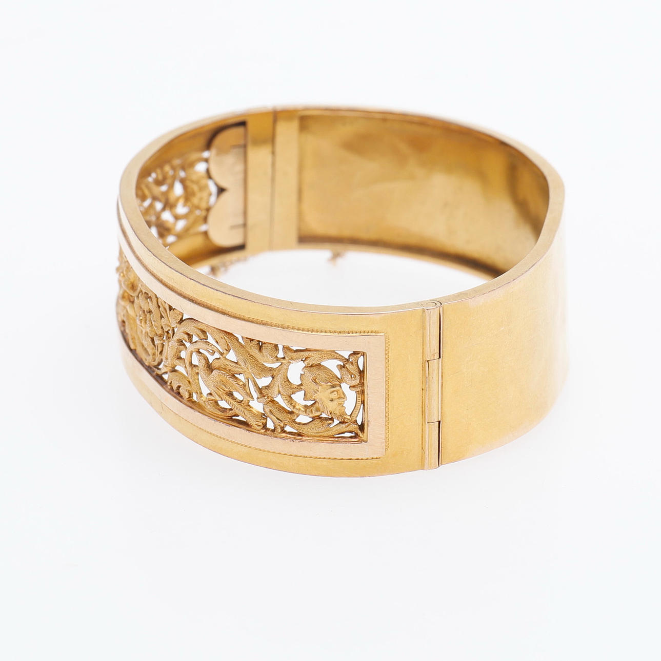 New Renaissance. 18k gold in two colors with openwork grotesque ornamentation. Stamped in Stockholm in 1884. Mortise lock and safety chain. Length 7, width 5.5 cm, weight 20.7 grams. Original case.