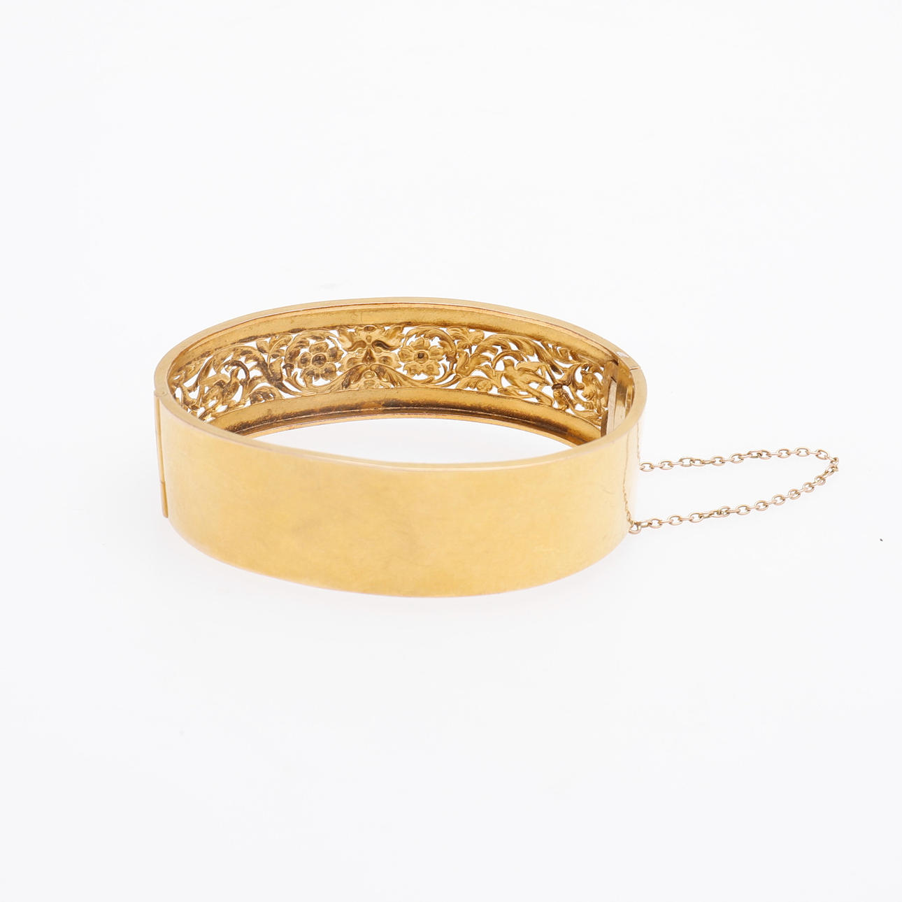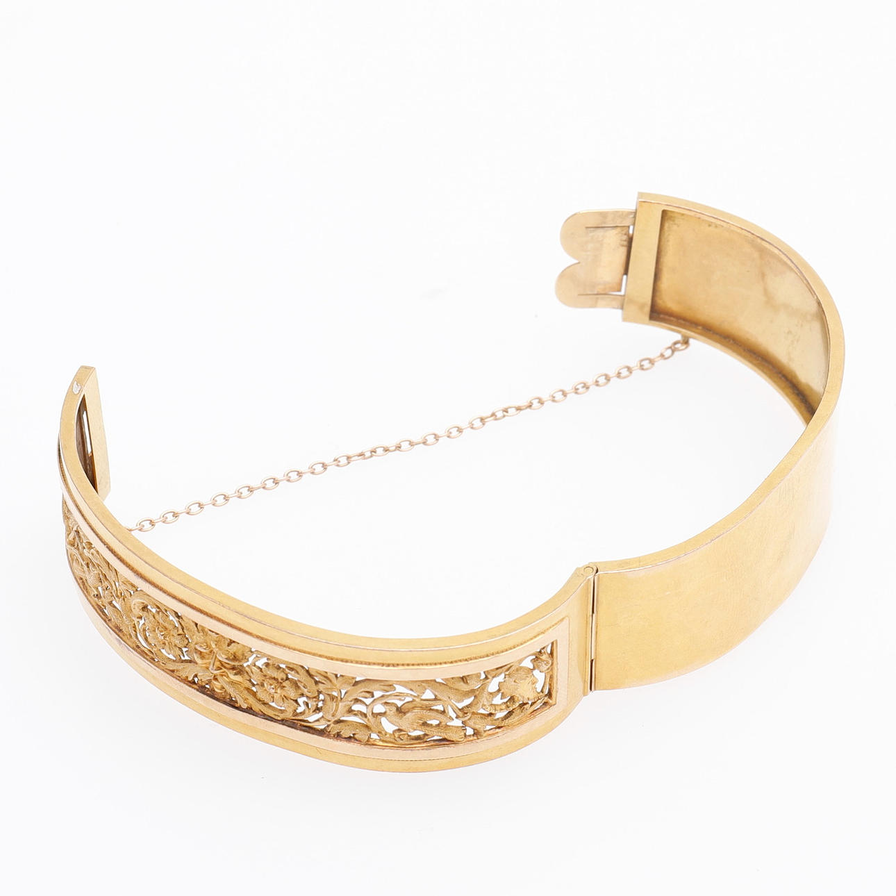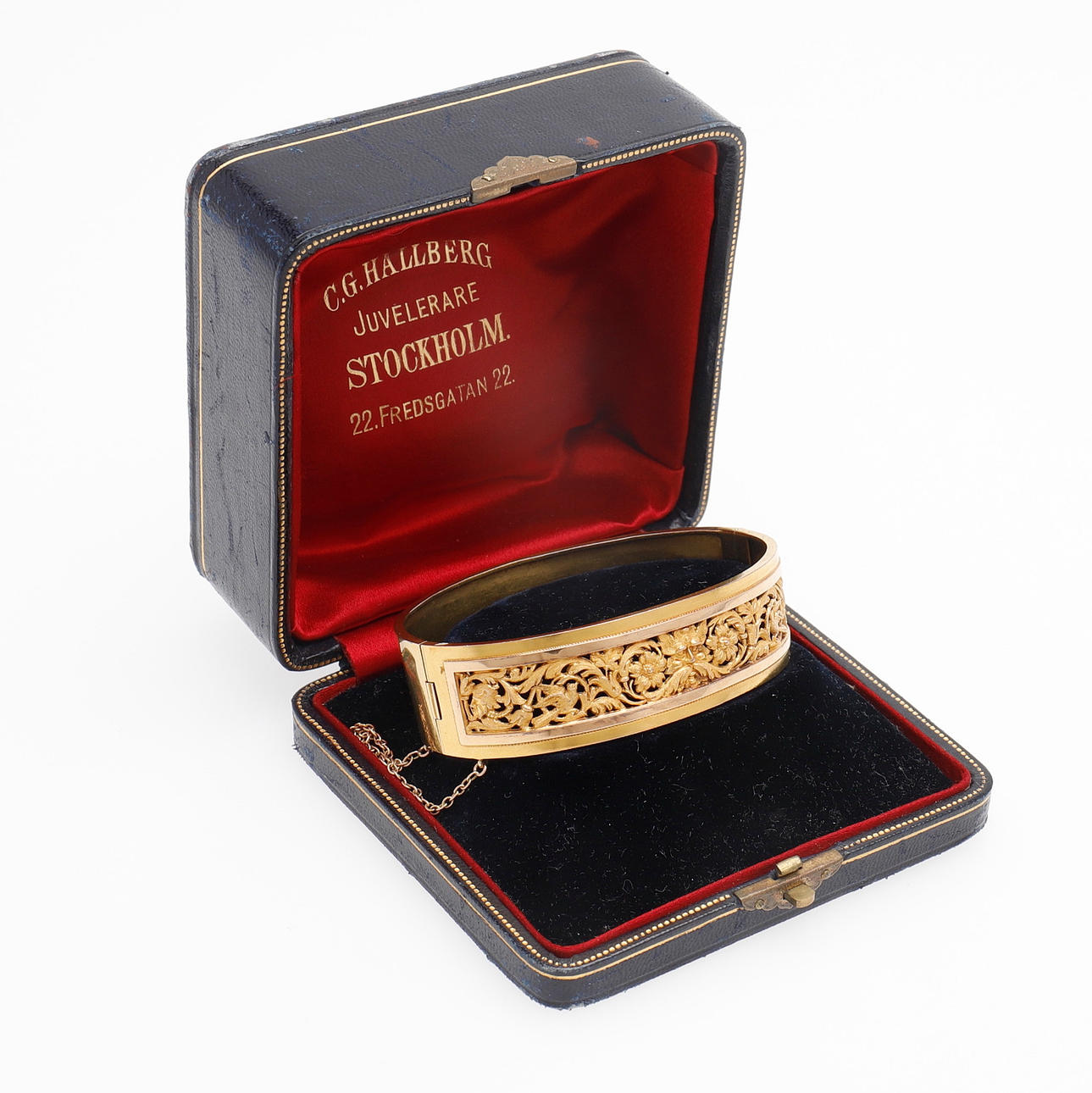 New Renaissance. 18k gold in two colors with openwork grotesque ornamentation. Stamped in Stockholm in 1884. Mortise lock and safety chain. Length 7, width 5.5 cm, weight 20.7 grams. Original case.