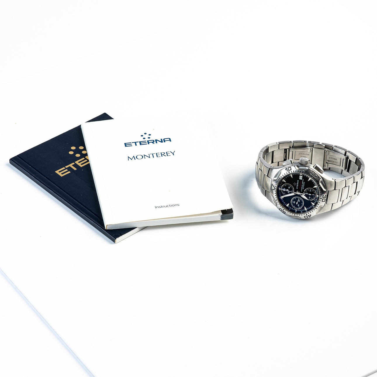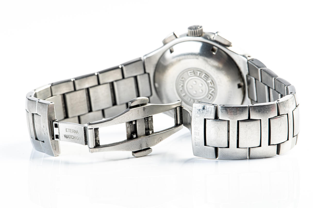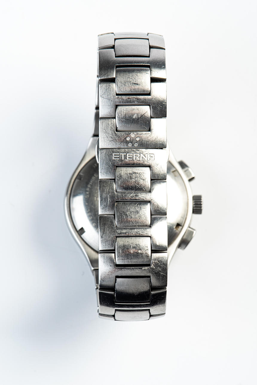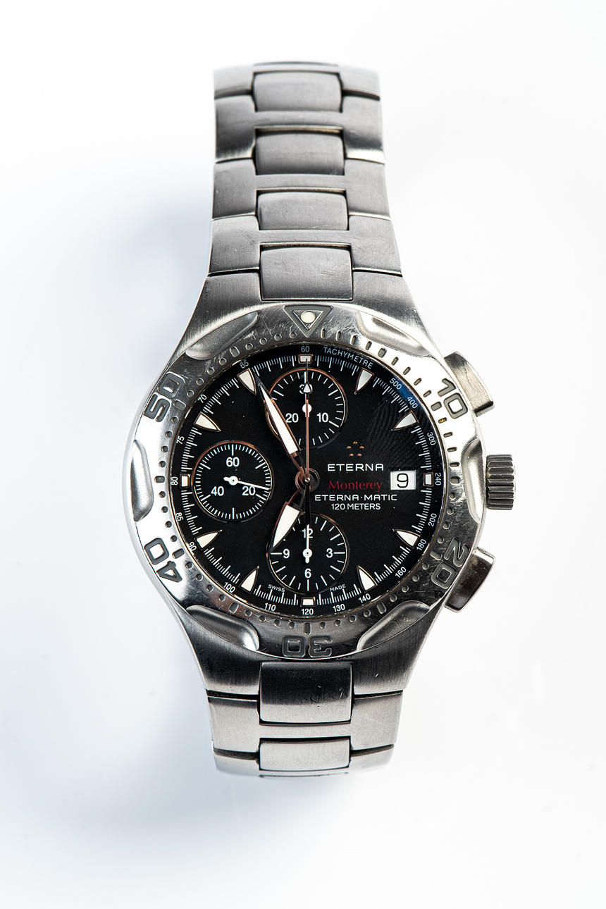 ETERNA, WRISTWATCH, model 'MONTEREY', automatic movement, chronograph, reference number: 1630.41, with a case made of steel and sapphire glass, rotating bezel, screw-down crown, with a black dial with luminous hands and luminous indices and a date display, bracelet also made of steel a butterfly clasp, case diameter: 41mm, strap length: approx. 19cm, attached with guarantee certificate and operating instructions.
