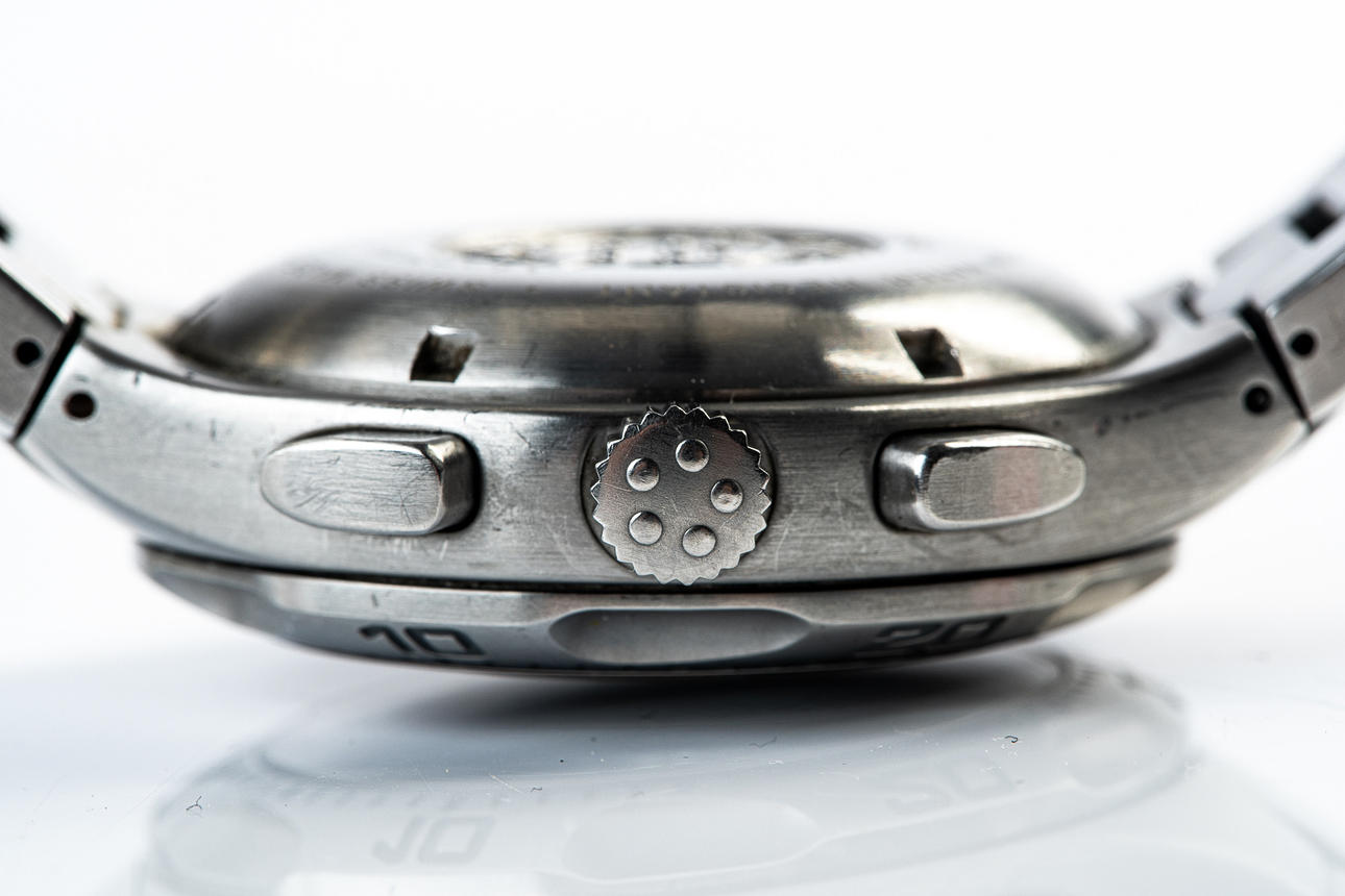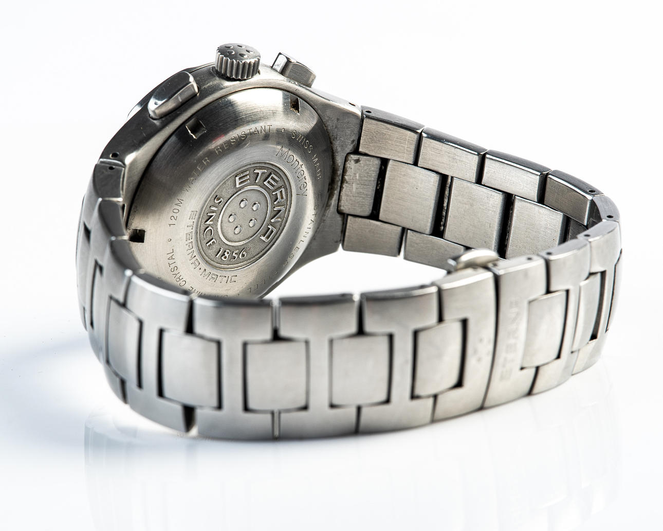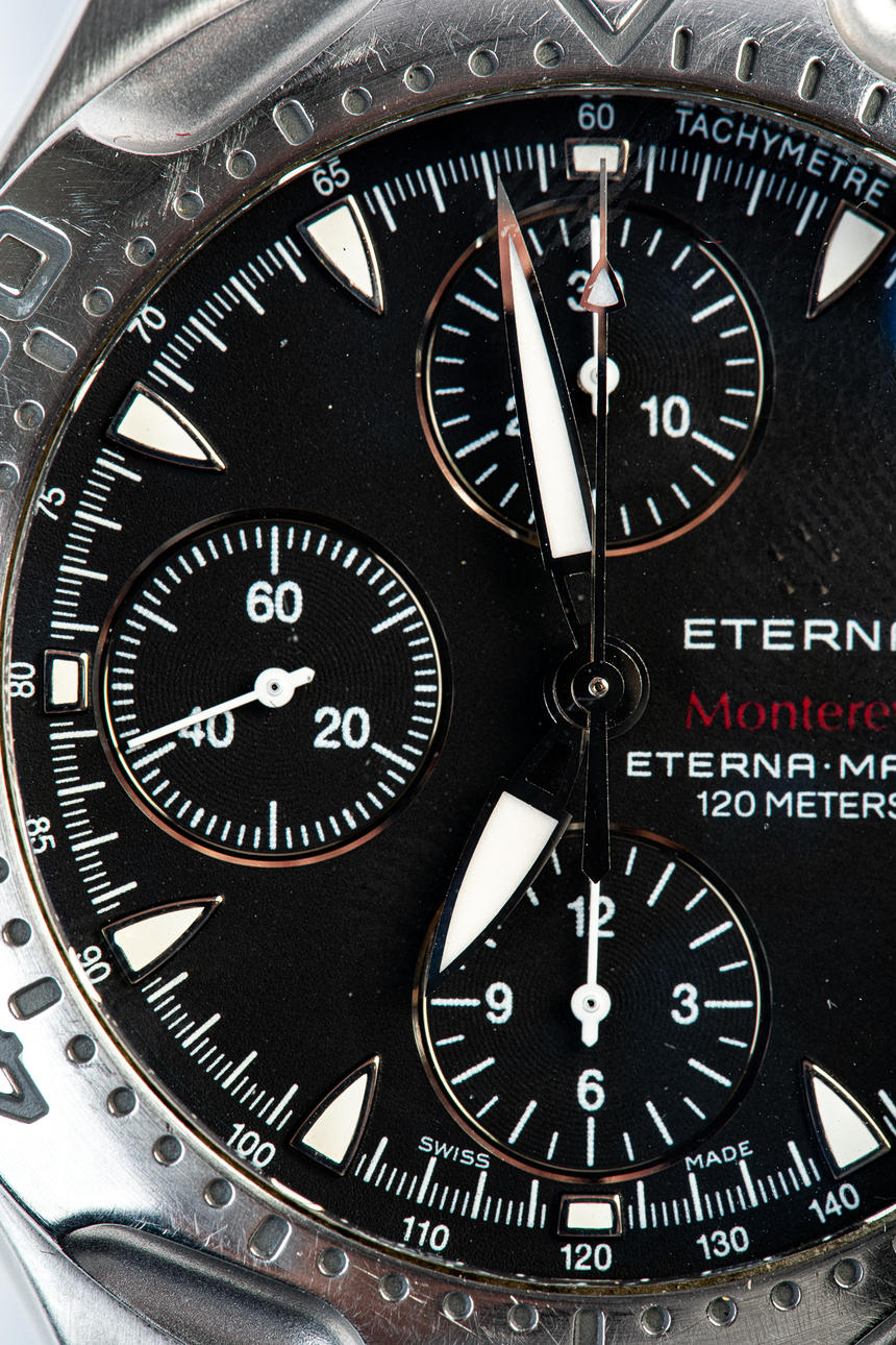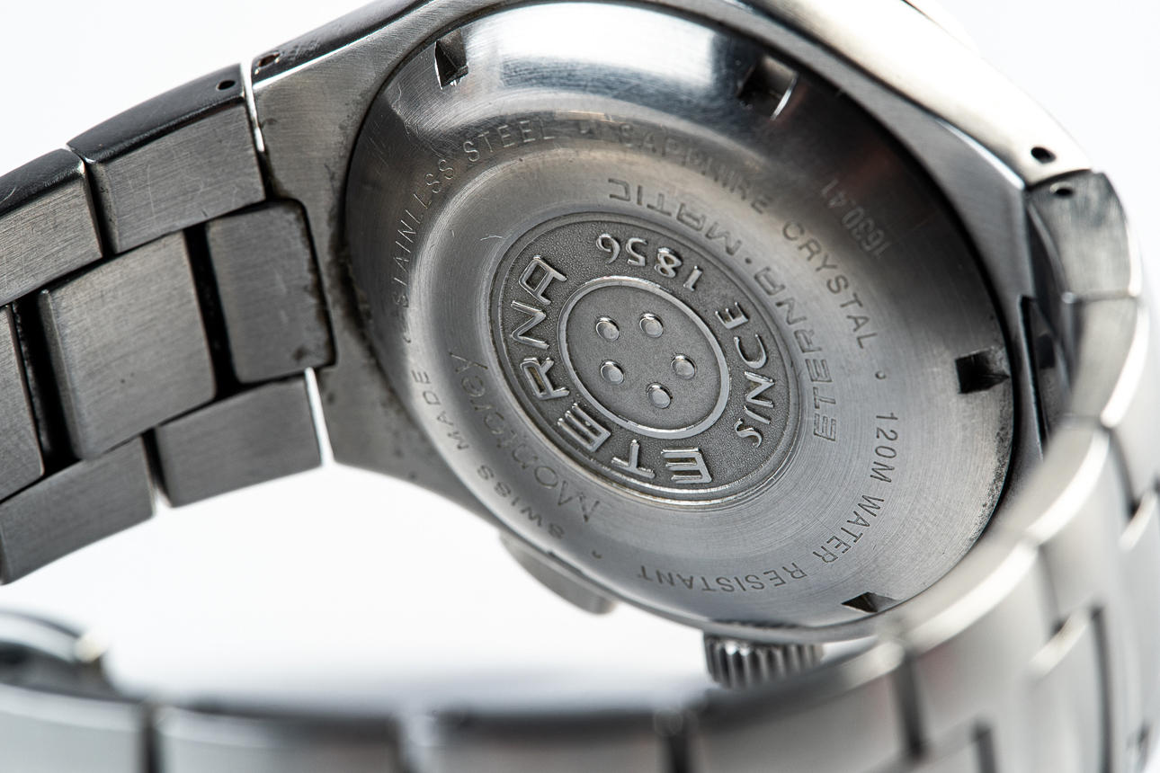 ETERNA, WRISTWATCH, model 'MONTEREY', automatic movement, chronograph, reference number: 1630.41, with a case made of steel and sapphire glass, rotating bezel, screw-down crown, with a black dial with luminous hands and luminous indices and a date display, bracelet also made of steel a butterfly clasp, case diameter: 41mm, strap length: approx. 19cm, attached with guarantee certificate and operating instructions.