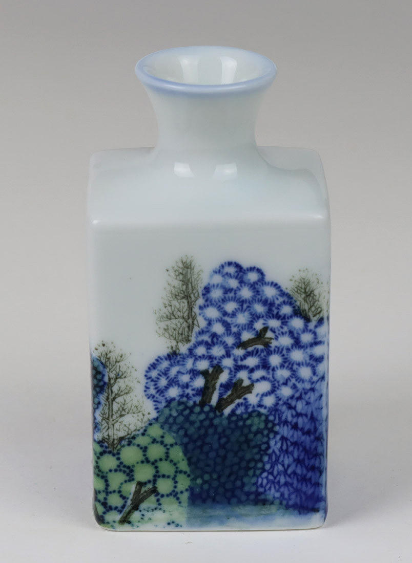 Porcelain with underglaze blue mark, rectangular body with tapered neck, painted all round with blue and green tree decoration underglaze, height approx. 11 cm.