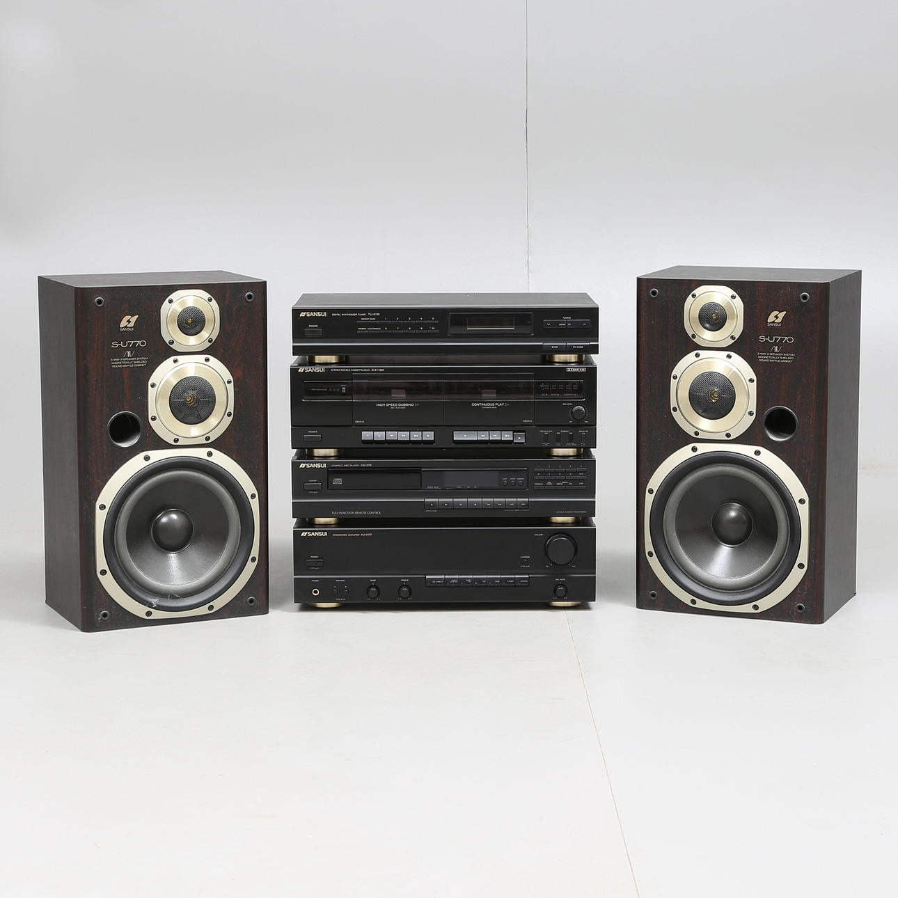 Amplifier, model AU-X117 CD player, model CD-270 Cassette deck, model D-X119W Tuner, model TU-X119 Speaker, S-U770.
