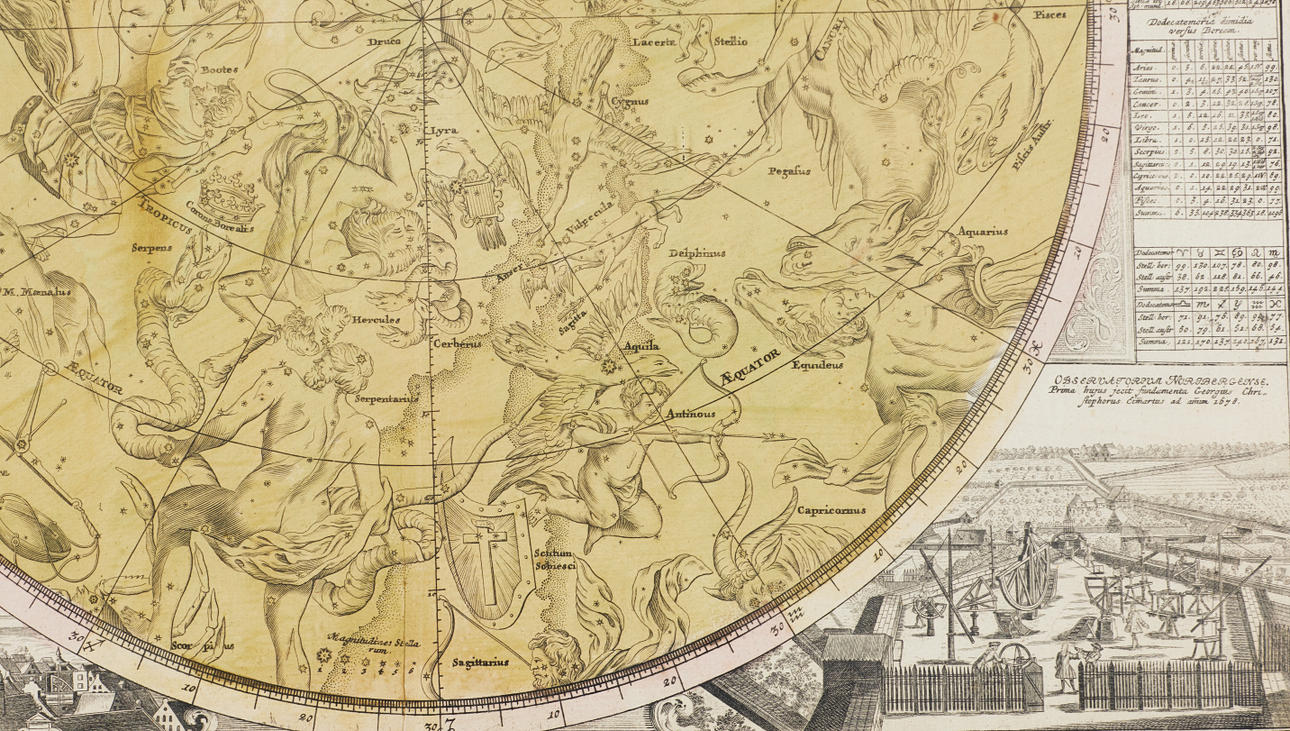 Engraved celestial chart with Zodiac figures and with four uncoloured views of different observatories in each corner. About 485x580 mm. The chart numbered 18. Framed.