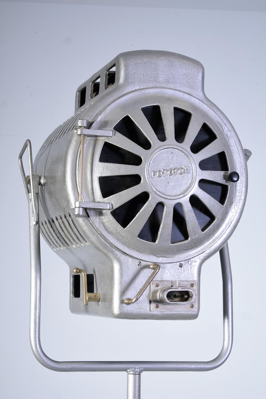 Spotlight, part of older film equipment. Around 1930 total height approx. 250 cm Length approx. 60 cm high approx. 75 cm Stand approx. 180 cm.