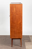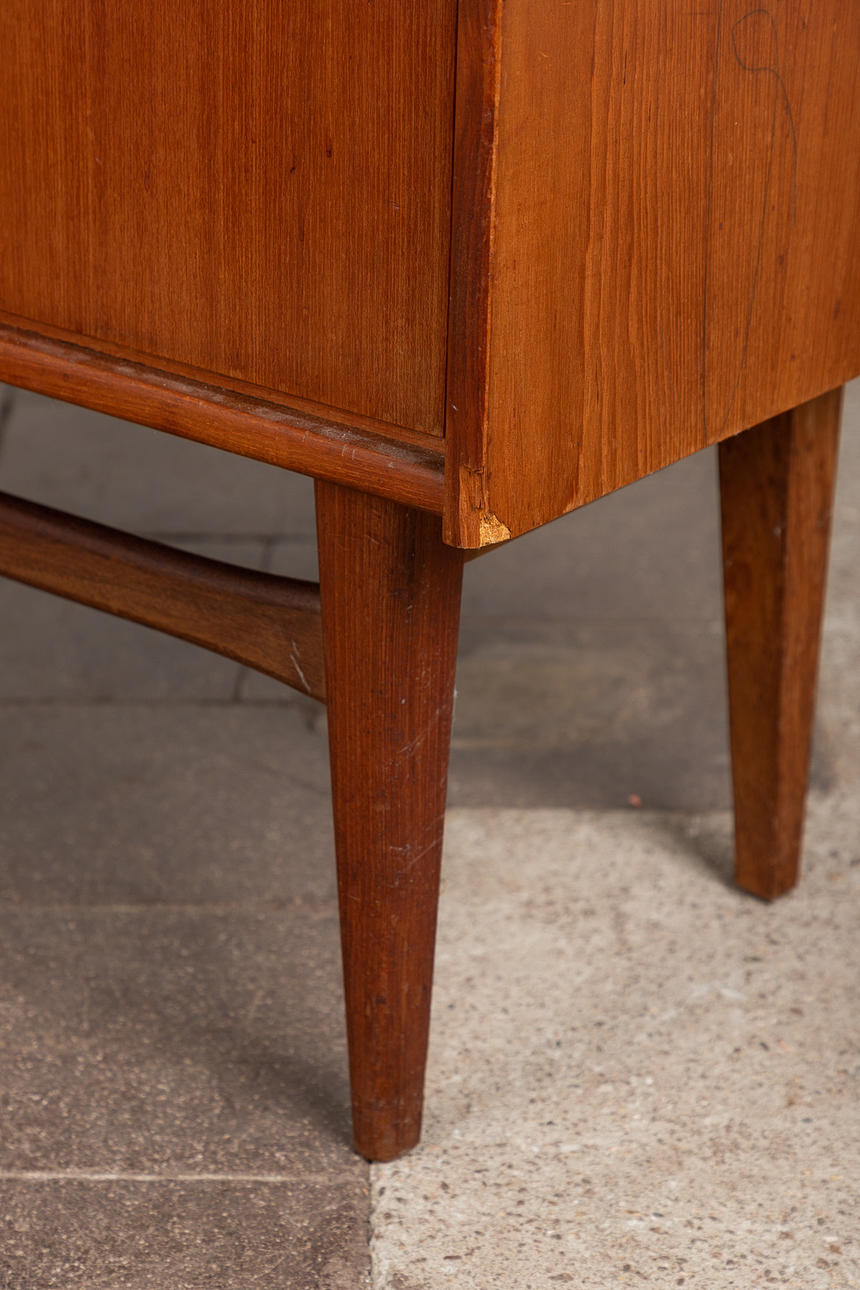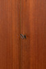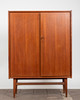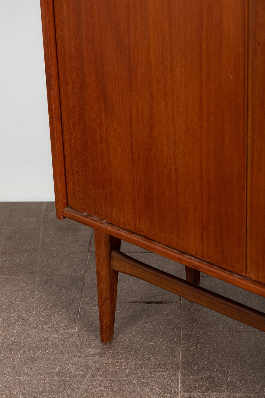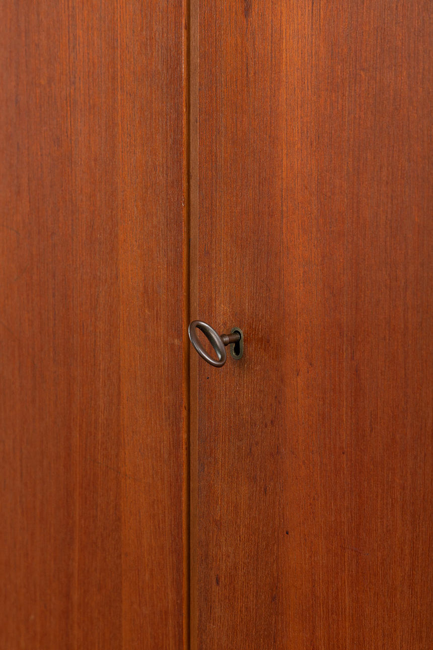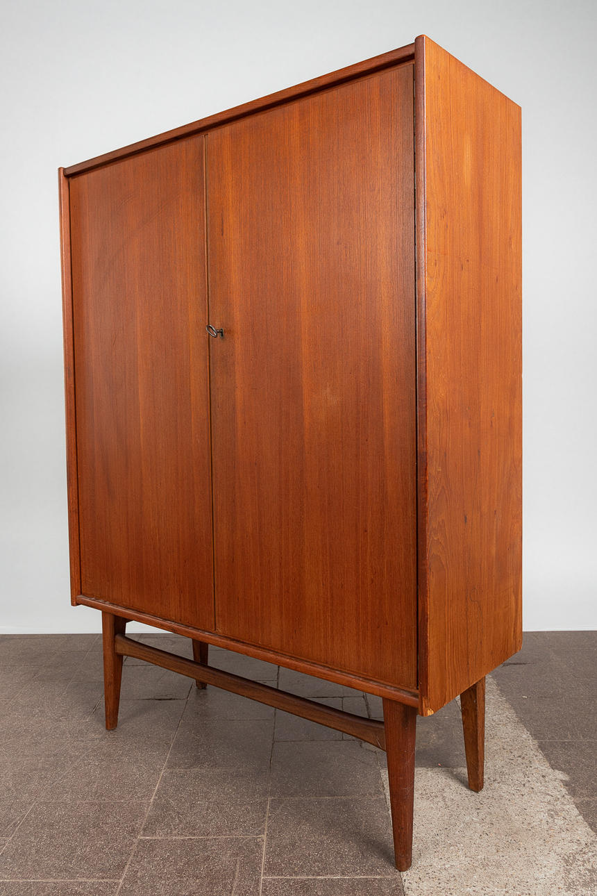 High board / cupboard, teak. Highboard with a box-shaped body made of teak, with two lockable doors and four shelves on the inside, key included and label on the back, H.145cm, L.104cm, D.40.5cm.