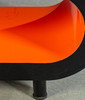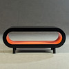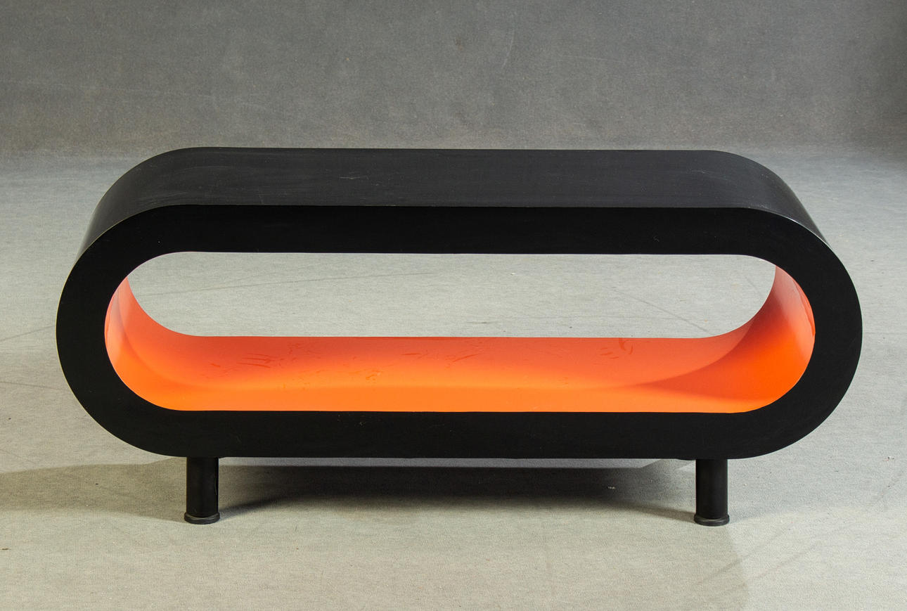 Wood, orange and black laminated. Feet adjustable in height. HxWxD: 46x110x41cm.