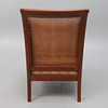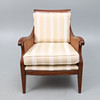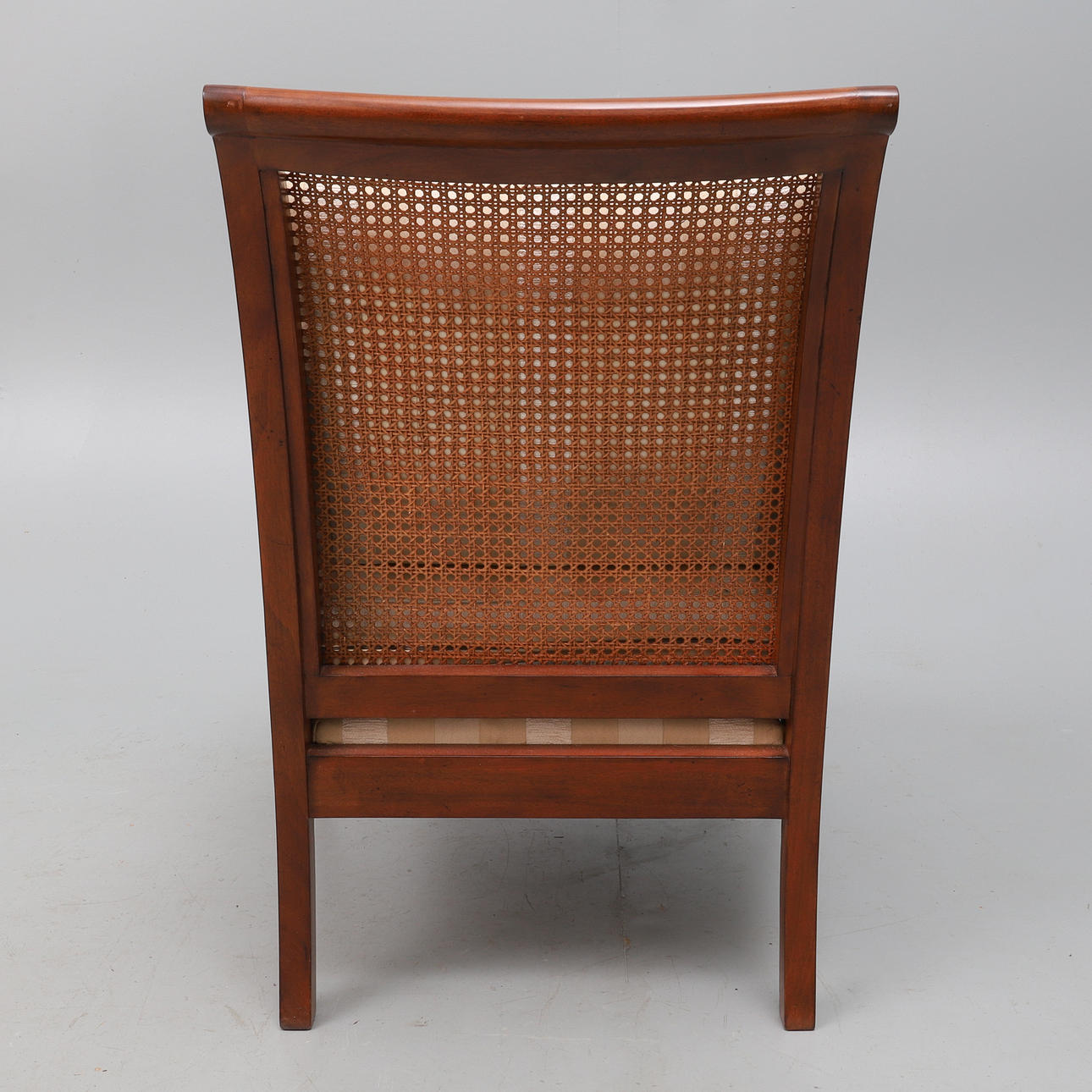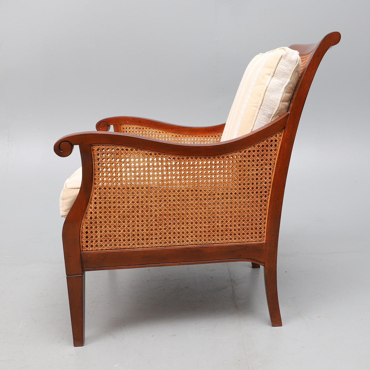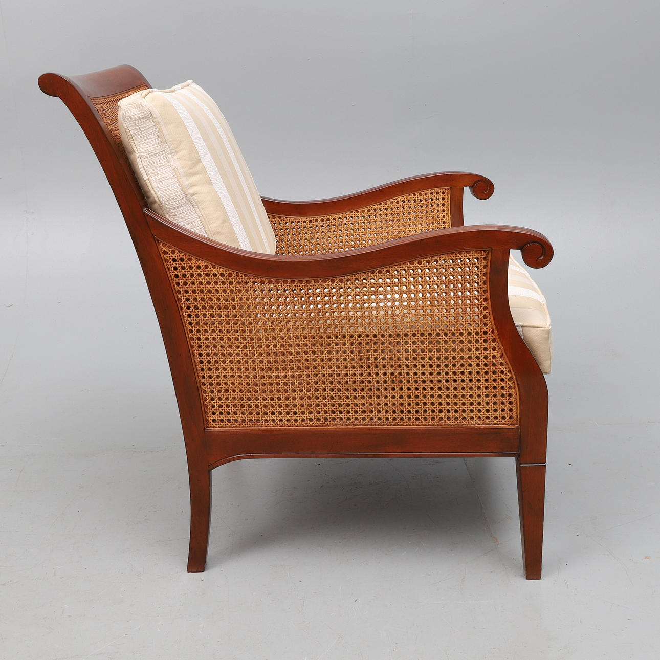 the mahogany frame bergere, with double caned sides and single cane back, upholstered in stripped material, with loose back and seat cushions, 67cm wide x 88cm high