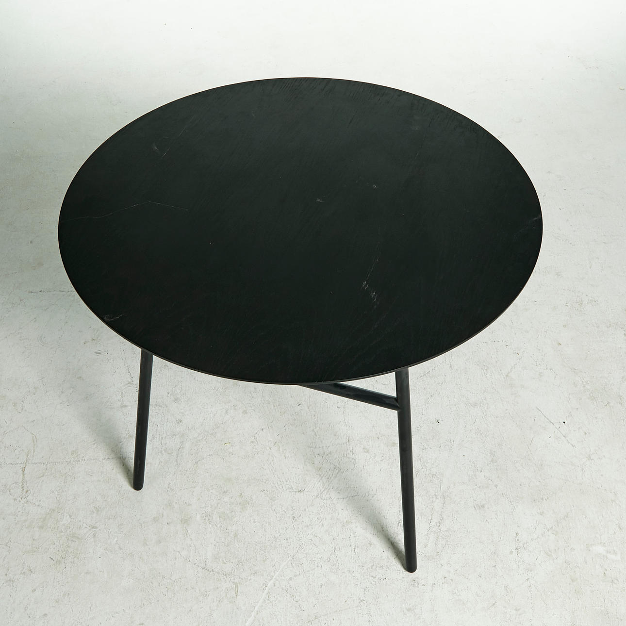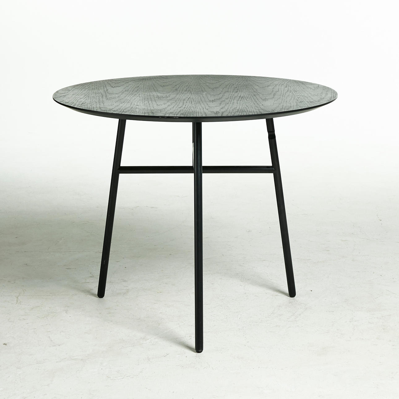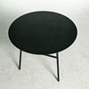 board of MDF with black ash veneer, steel base, height 74, diameter 90 cm.