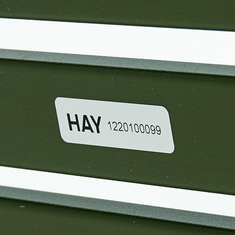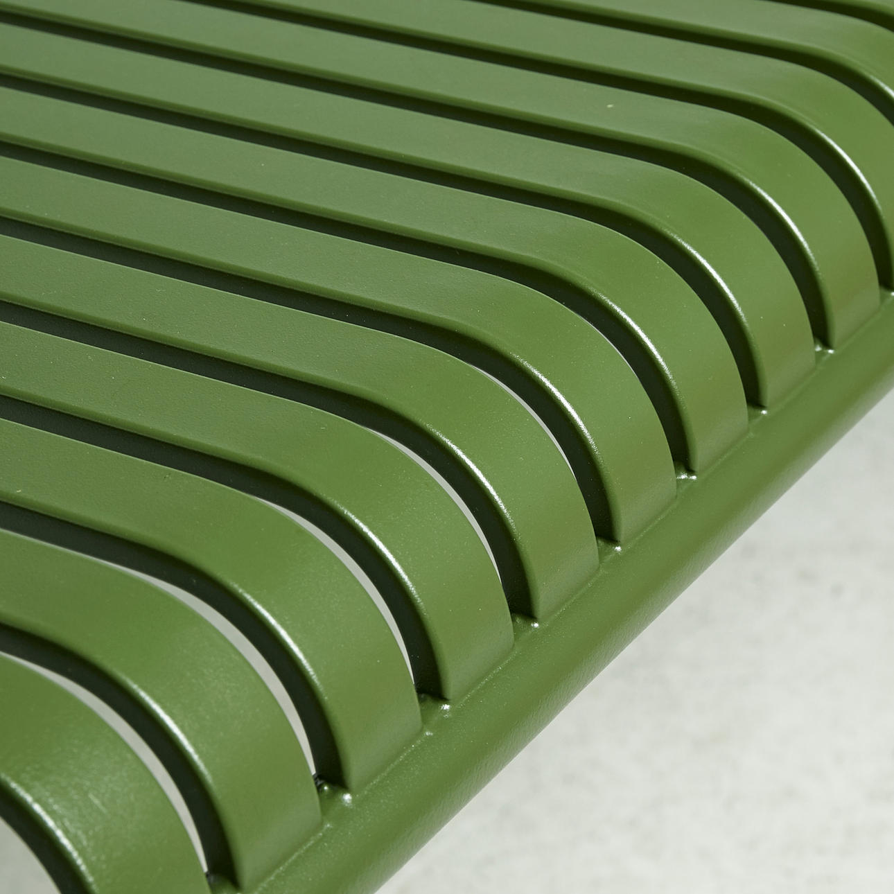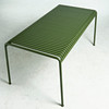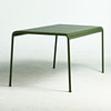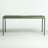 frame of powder-coated steel in olive green, table top of bent steel ribs, height 75, 170x90 cm.