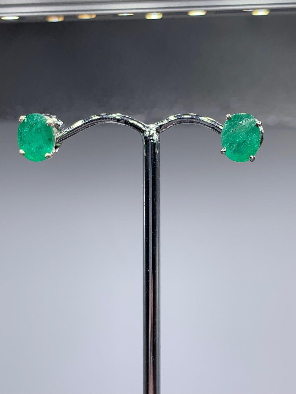 Each of the studs is set with a single, oval-cut emerald of 8 x 6 mm, approx.