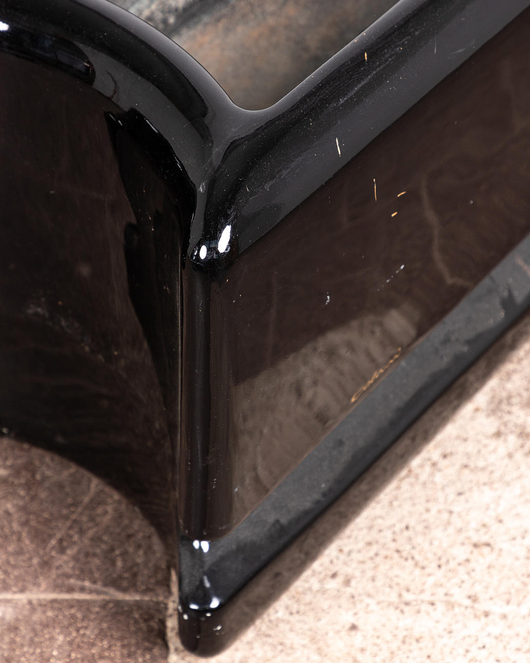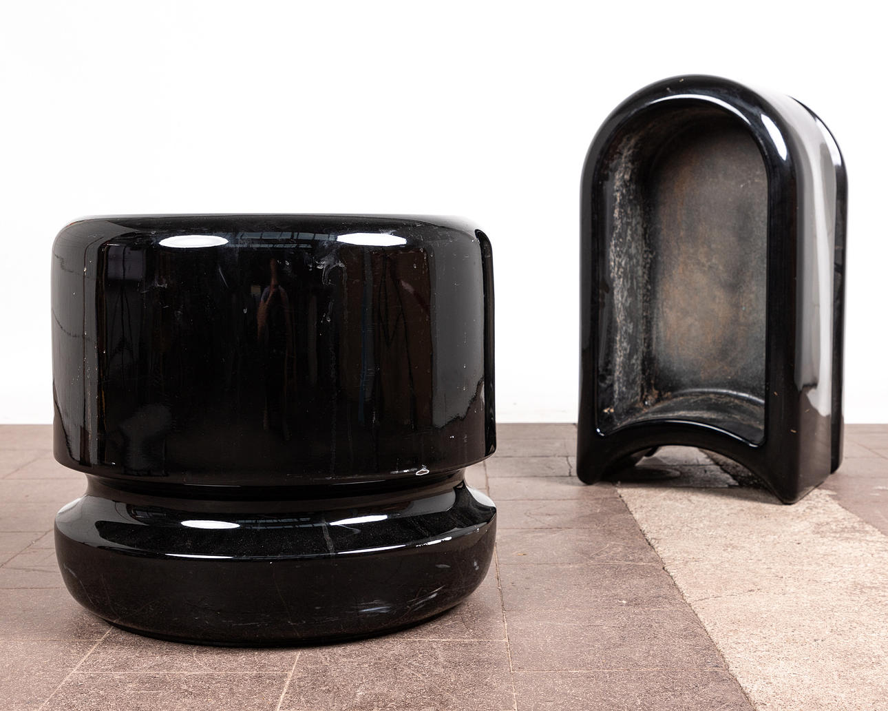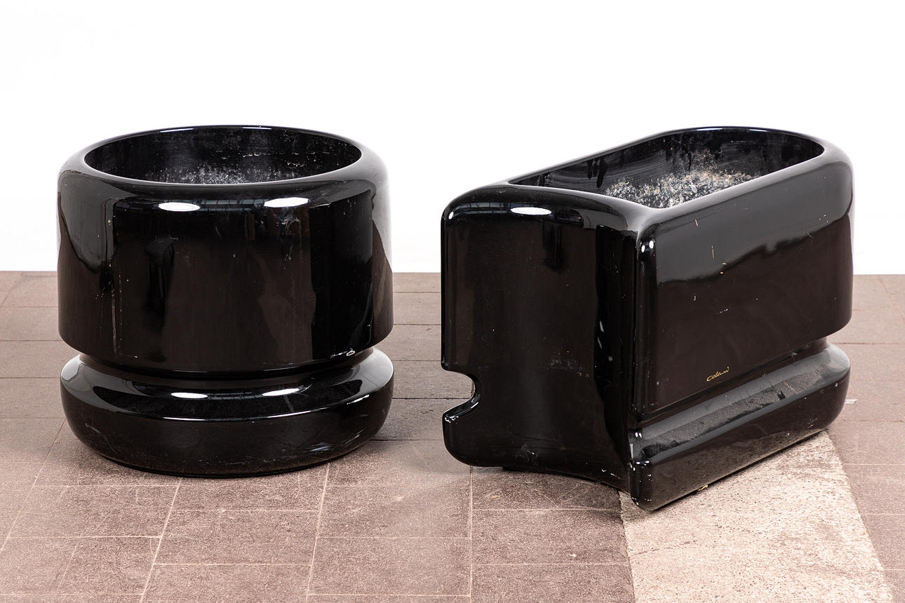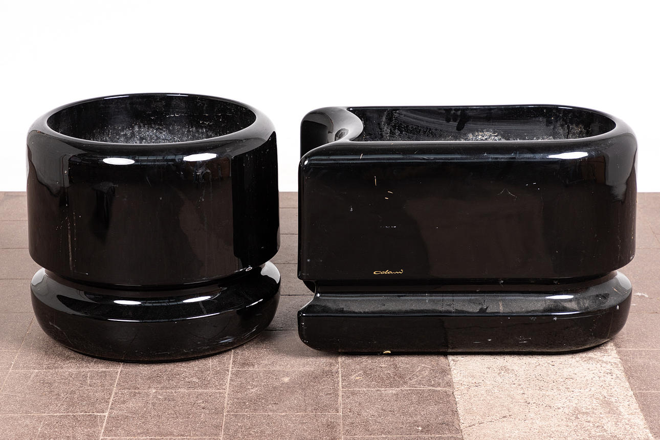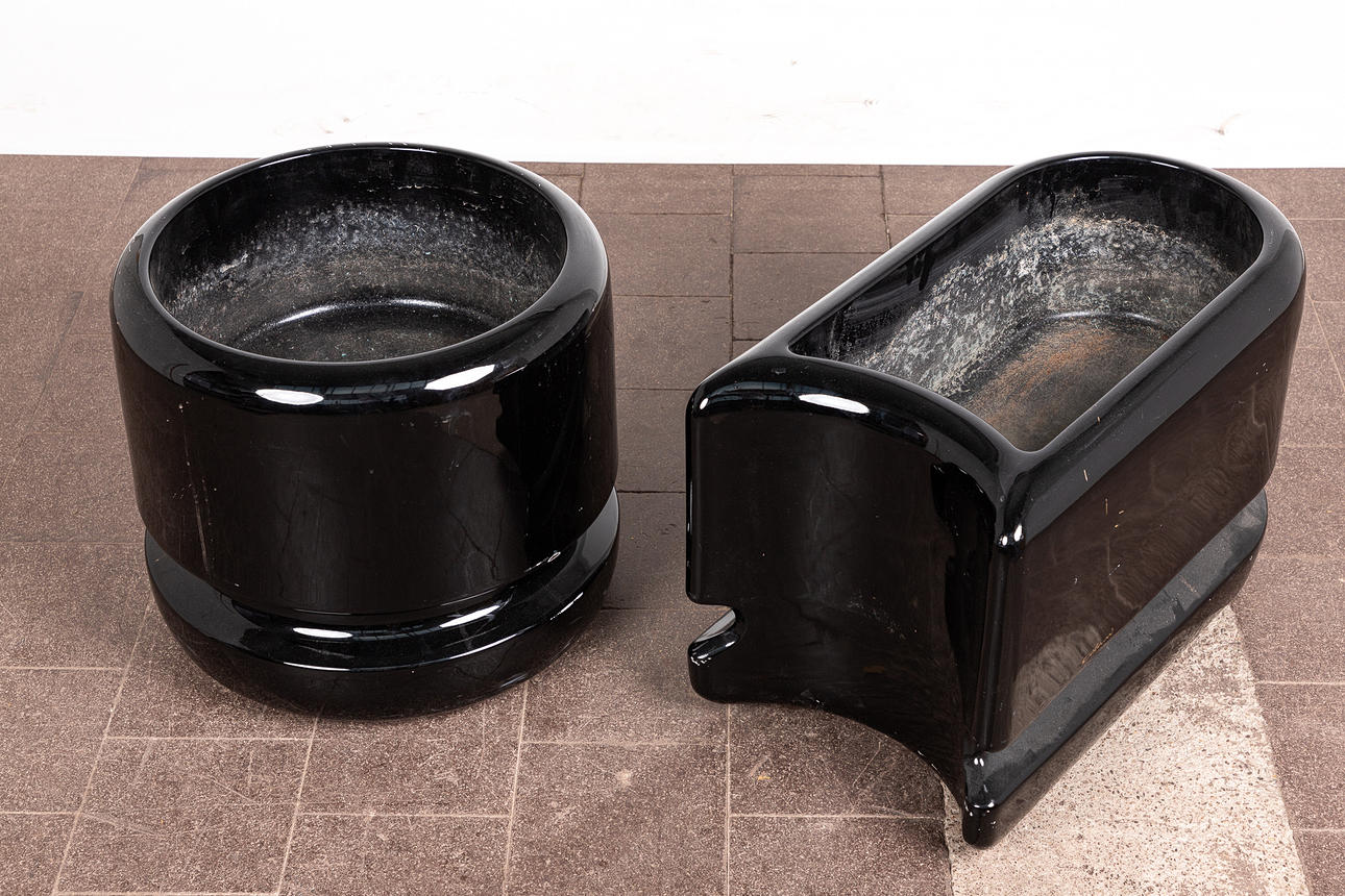Luigi Colani, two planters / cachepots, plastic, Germany, 1970s. Two plant pots made of black plastic, one round and one elongated, each with the manufacturer's designation on the side, H.50cm, L.58-80cm, W.44-.58cm. (2).