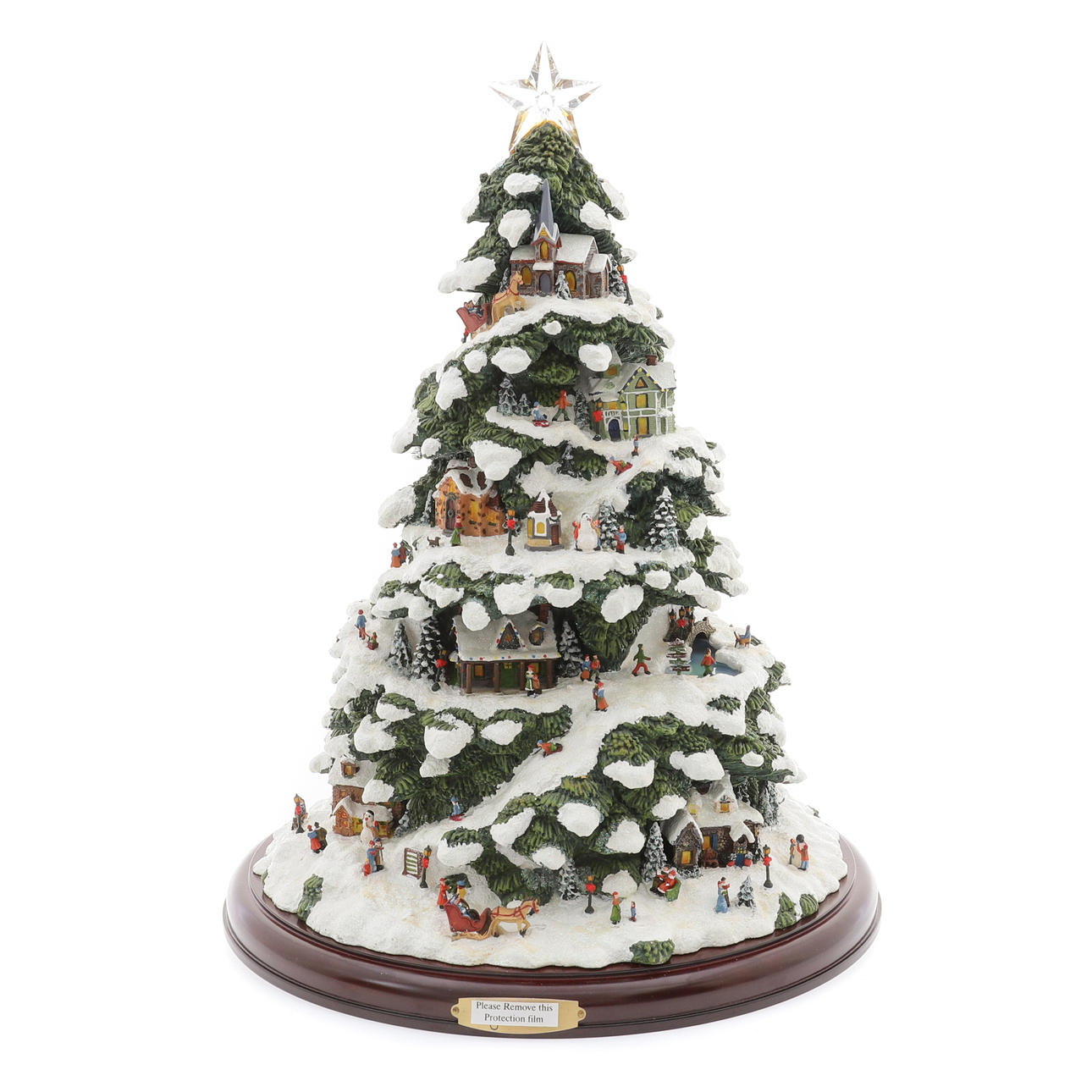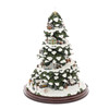 illuminated tree, Sculpture number C3354, a Christmas tree, pine branches covered in sparkling snow with buildings and characters, on a circular wooden plinth, base 29cm diameter x 38cm high, with certificate of Authenticity.