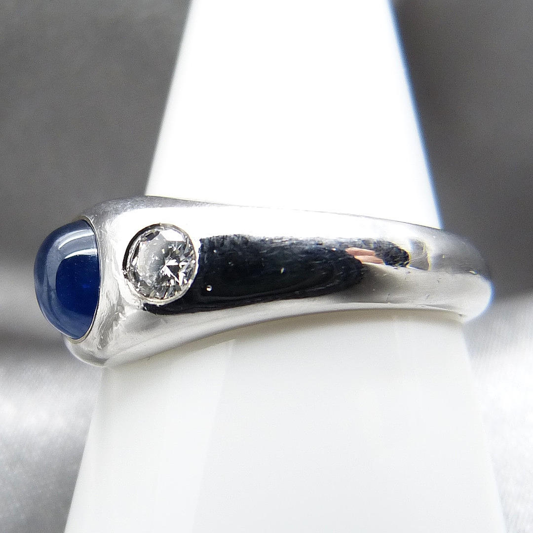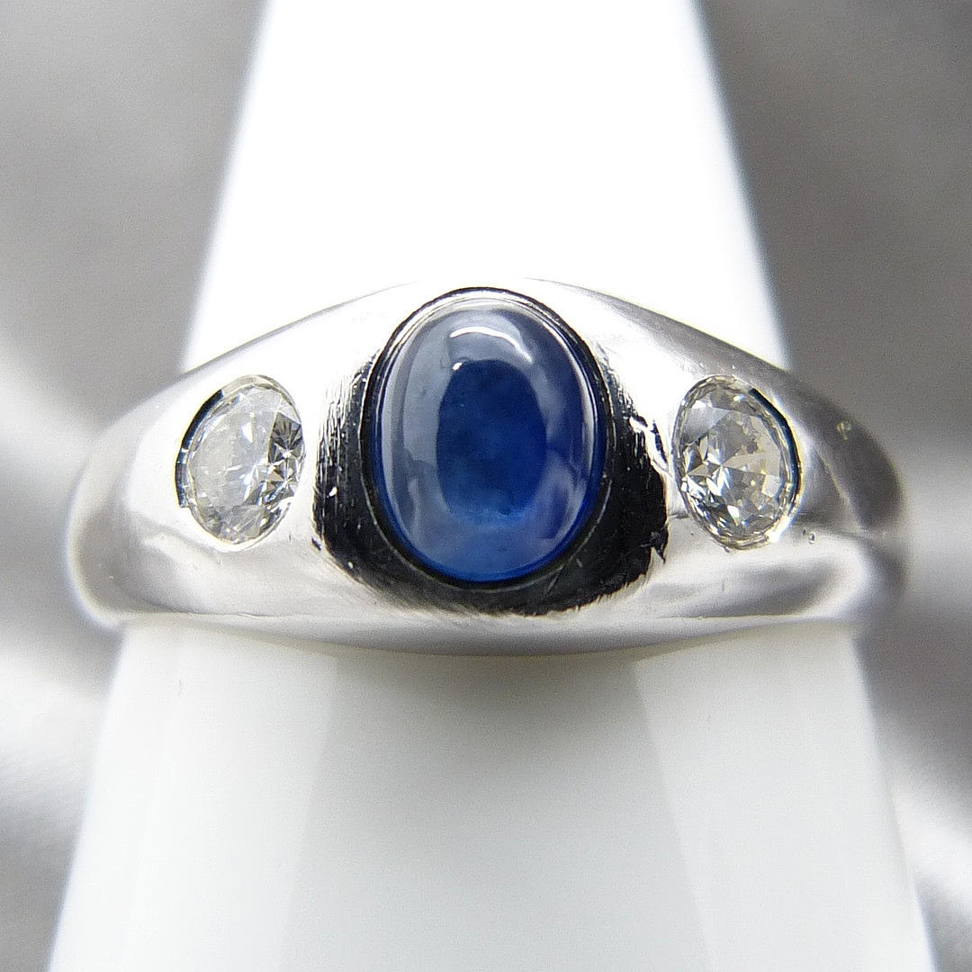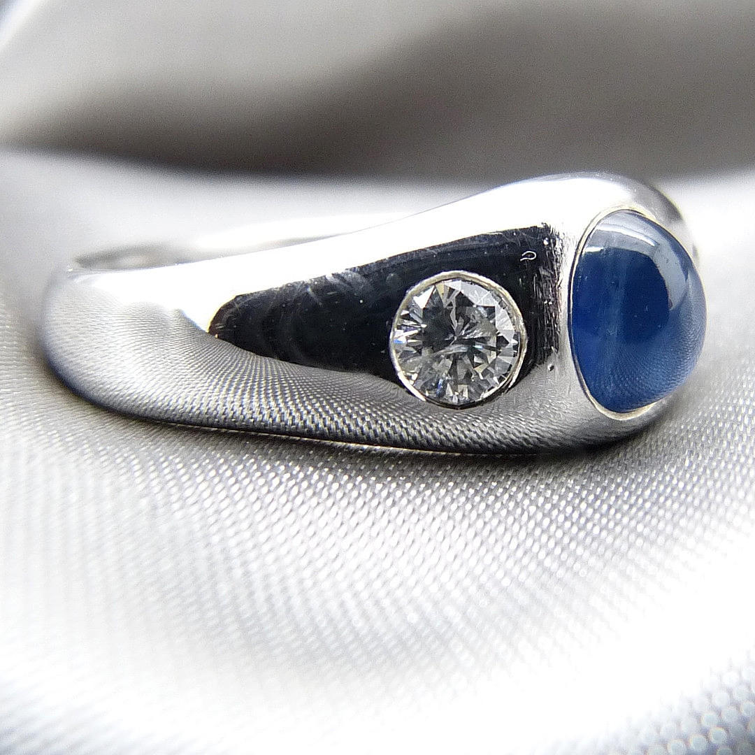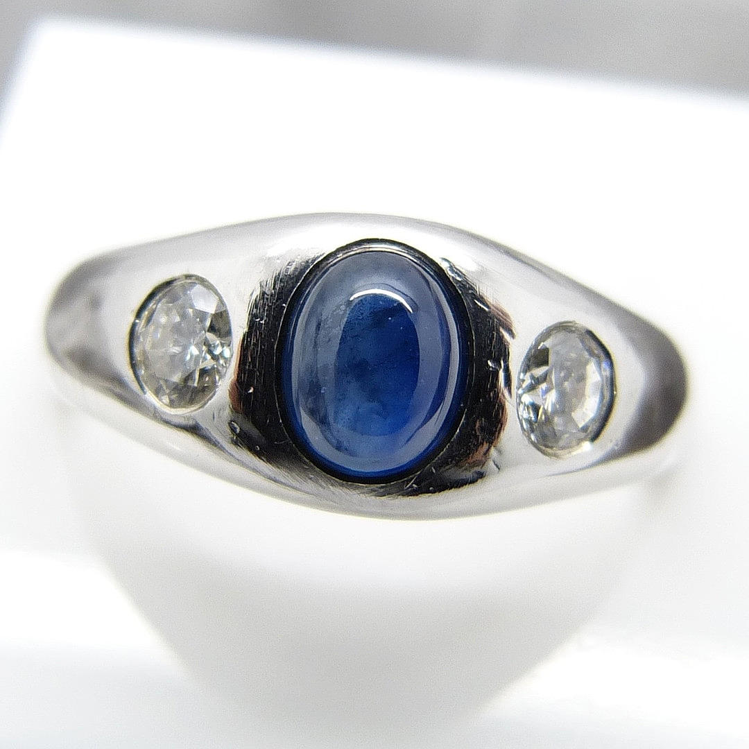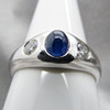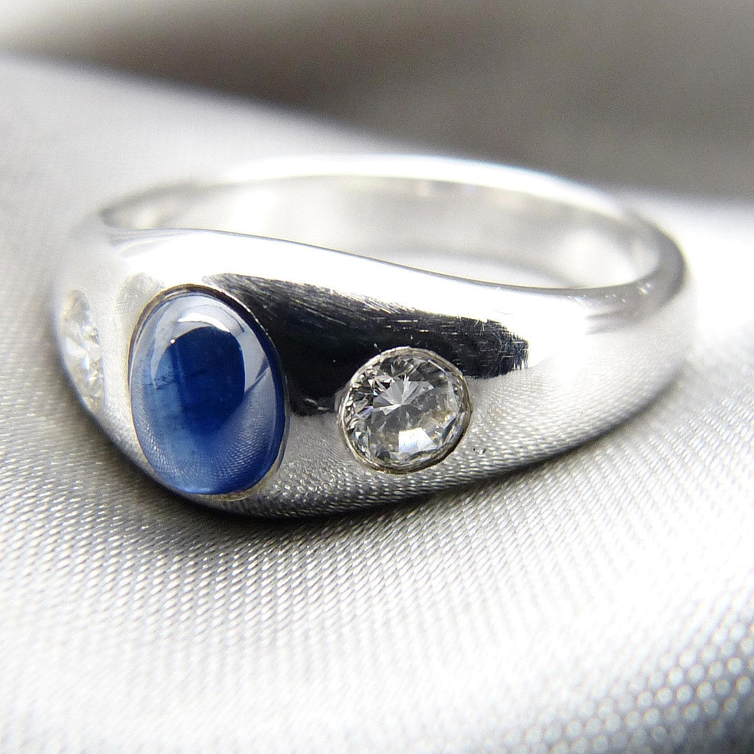 A 14k white gold gypsy ring set with cabochon sapphire and diamonds.