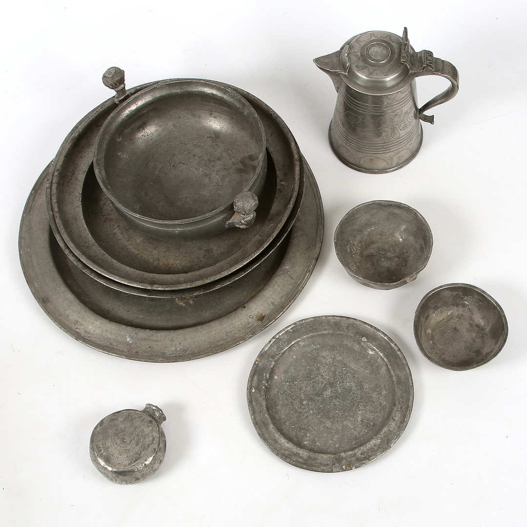 1810587. PEWTER OBJECTS, 9 pcs., 19th century.