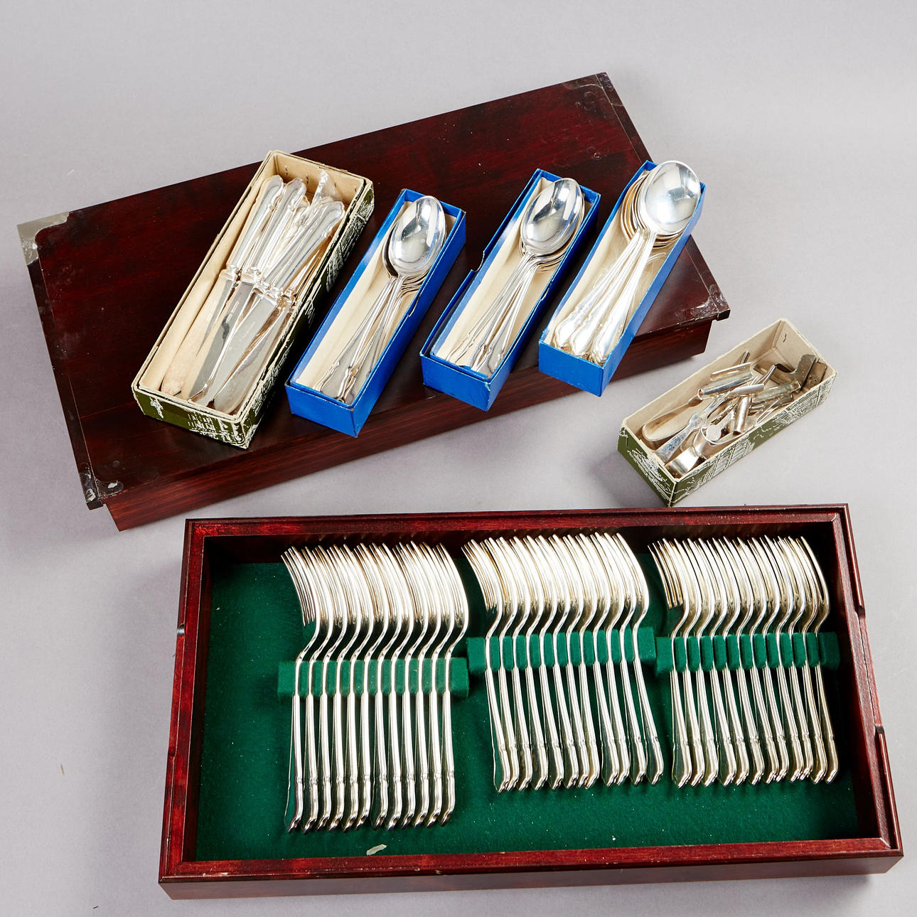CUTLERY, 102 dlr, nickel silver, Harrods, consisting of: 12 table spoons, 24 table forks, 12 table knives, 12 glass spoons, 12 dinner forks, 12 dinner knives, 12 fish knives, 6 tongs, partly in boxwood.