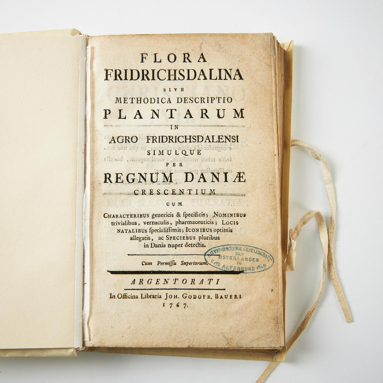 Modern thin vellum wrapper with leather tie (1 damage to back cover). Owner stamp on title page (Naturforschende Gesellschaft des Osterlandes, Altenburg).