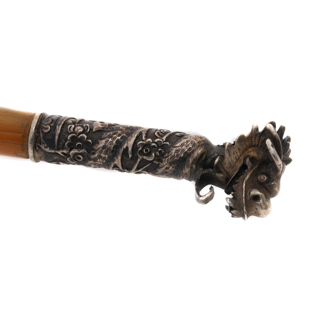 unmarked, the surmount cast with a dragon head and entwined with a dragon, the cylindrical horn stick with a pointed terminal, 61cm long.