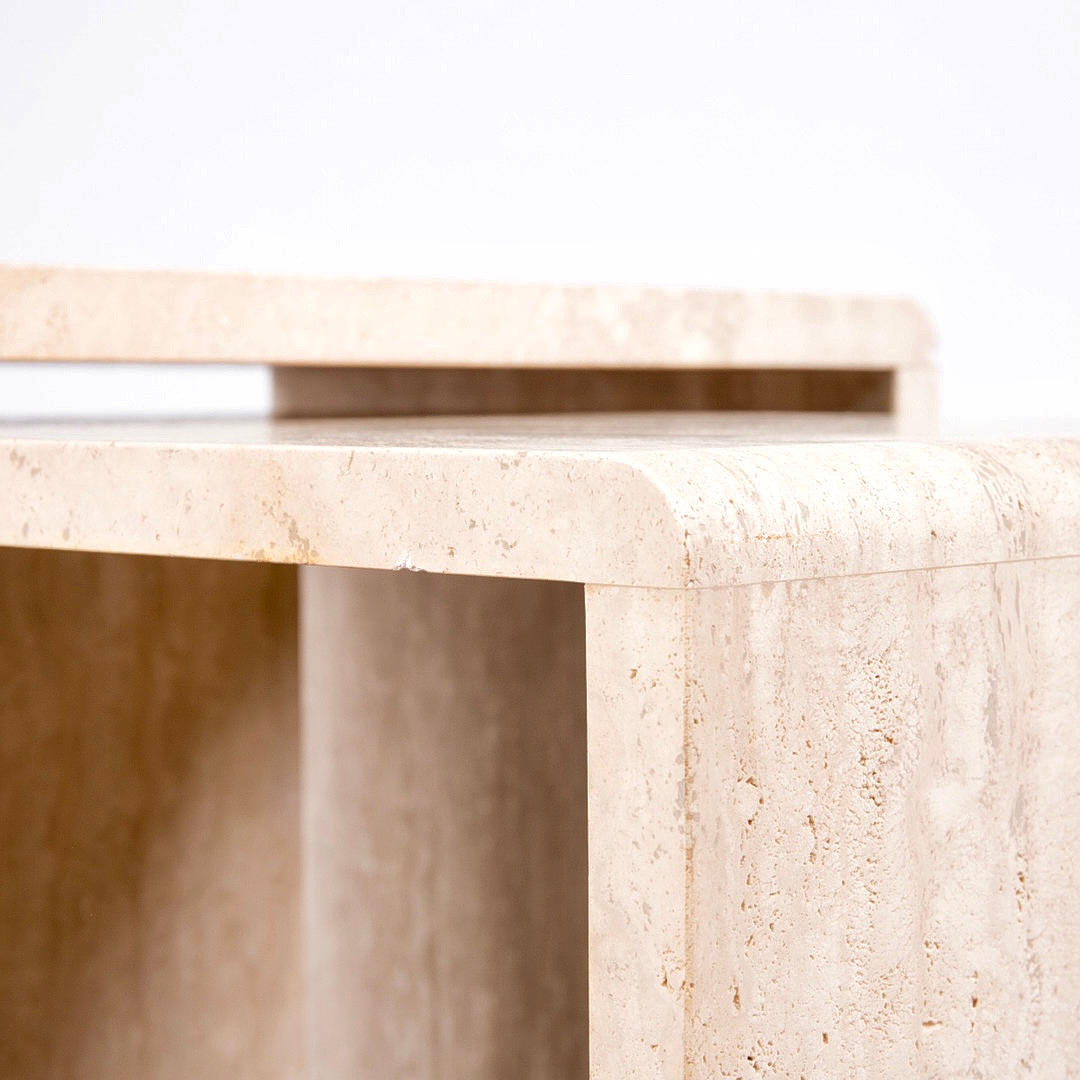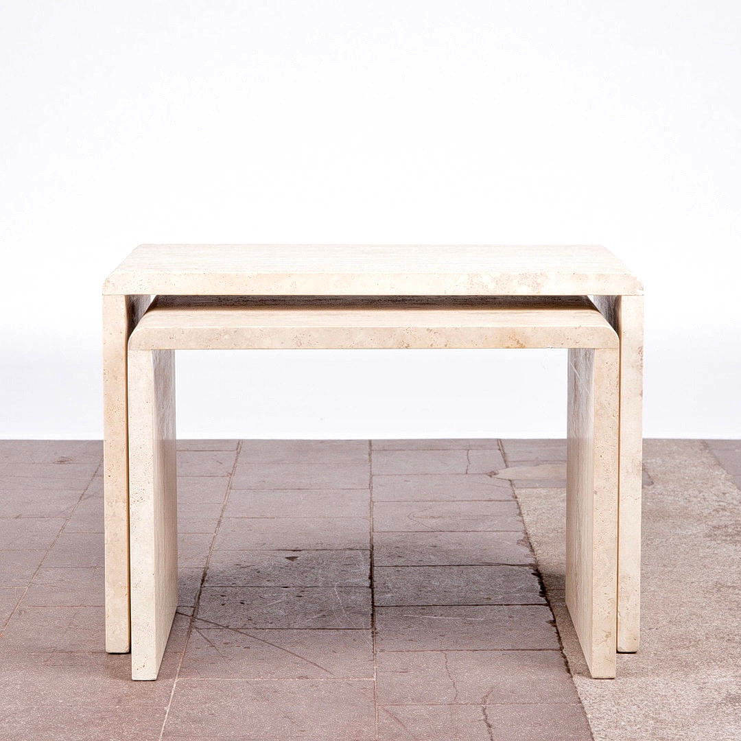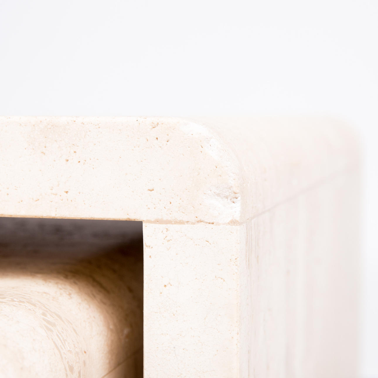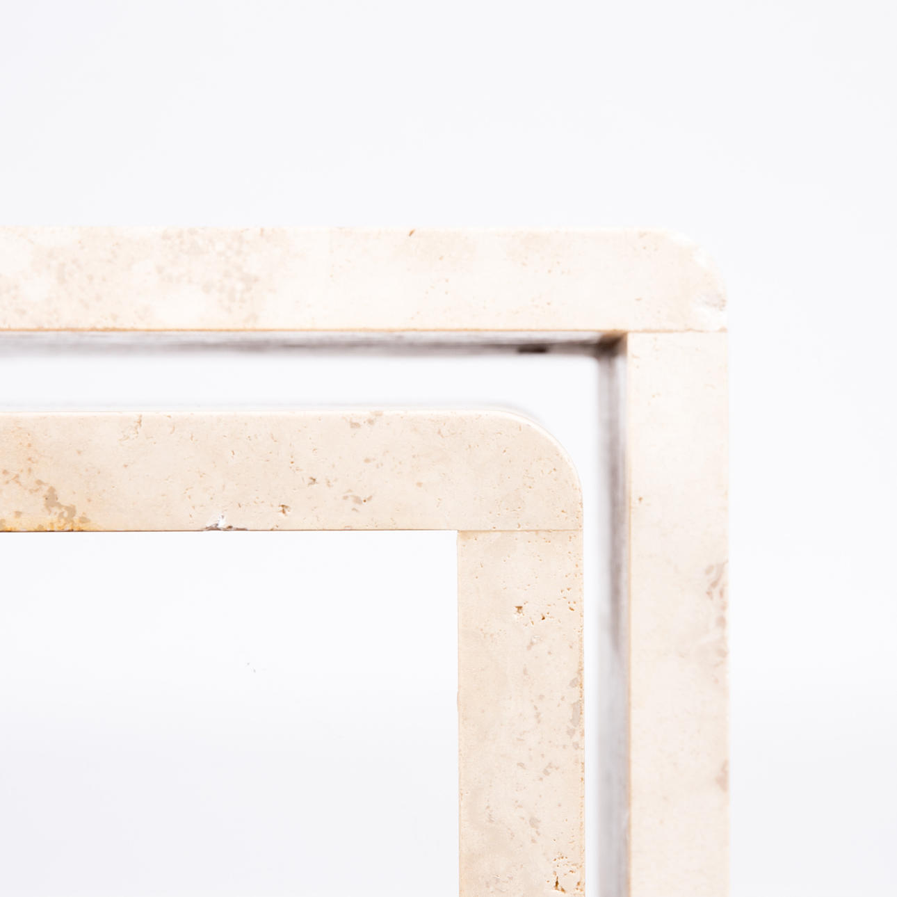 Two side tables, travertine, Italy, 1970s. Pair of travertine side tables in two sizes, H.45-50cm, L.61-70cm, W.40cm. (2).