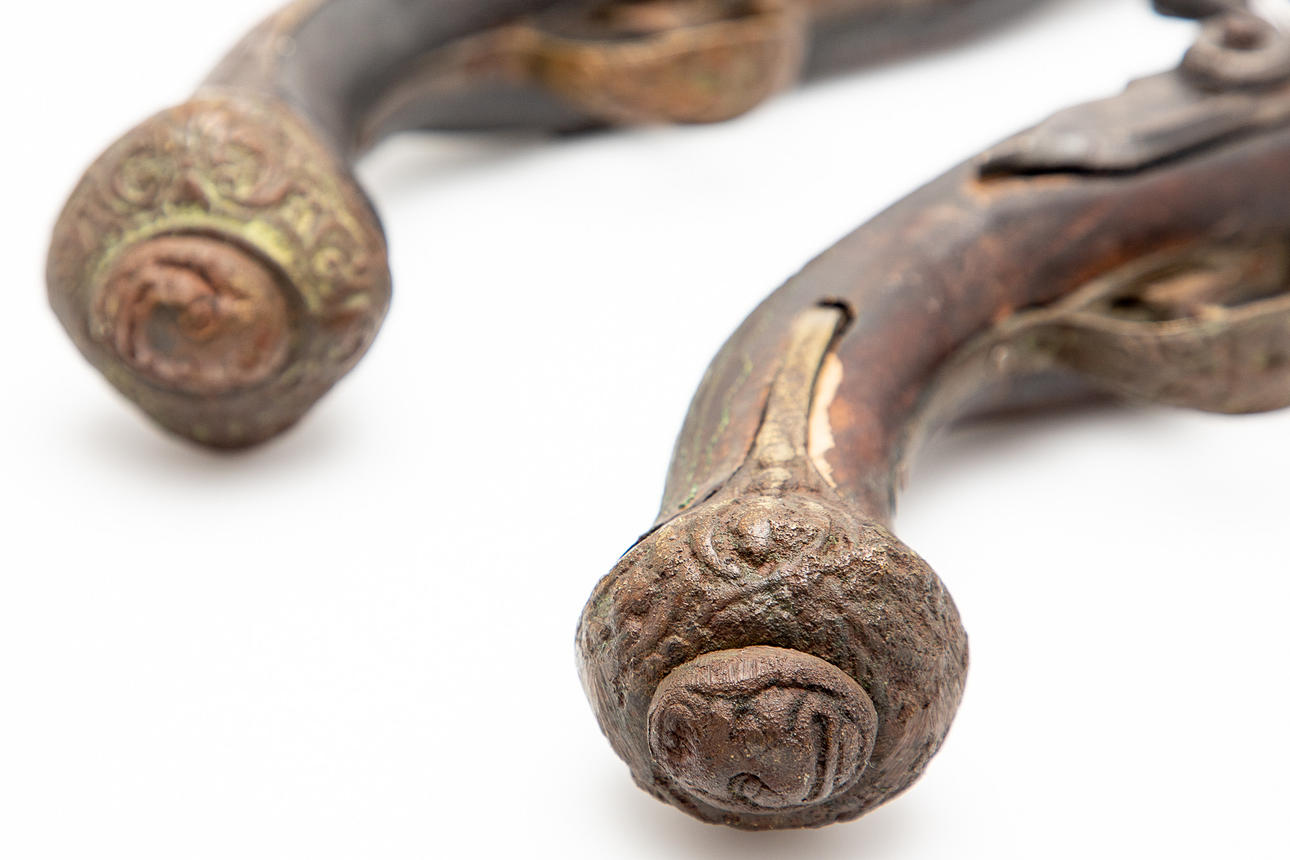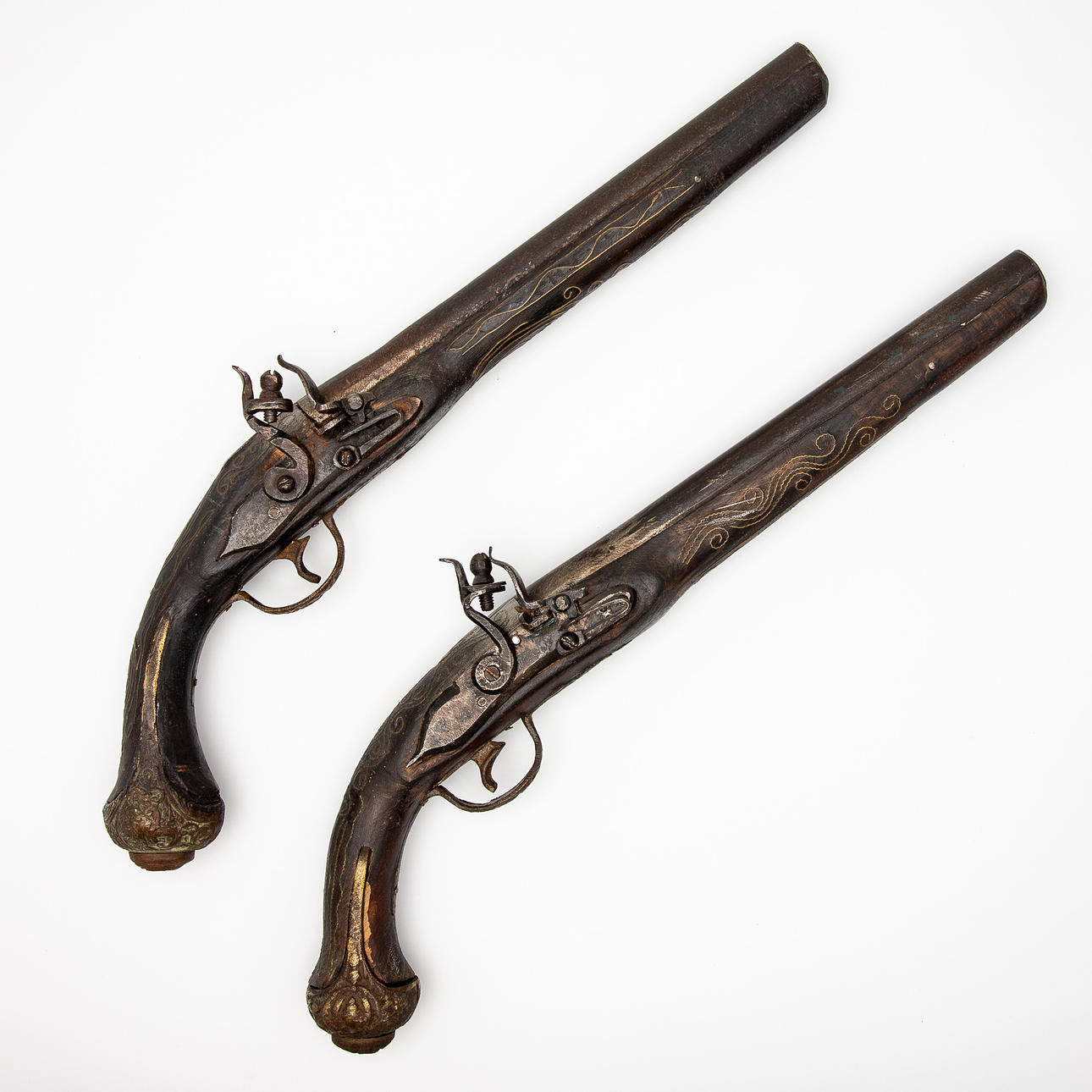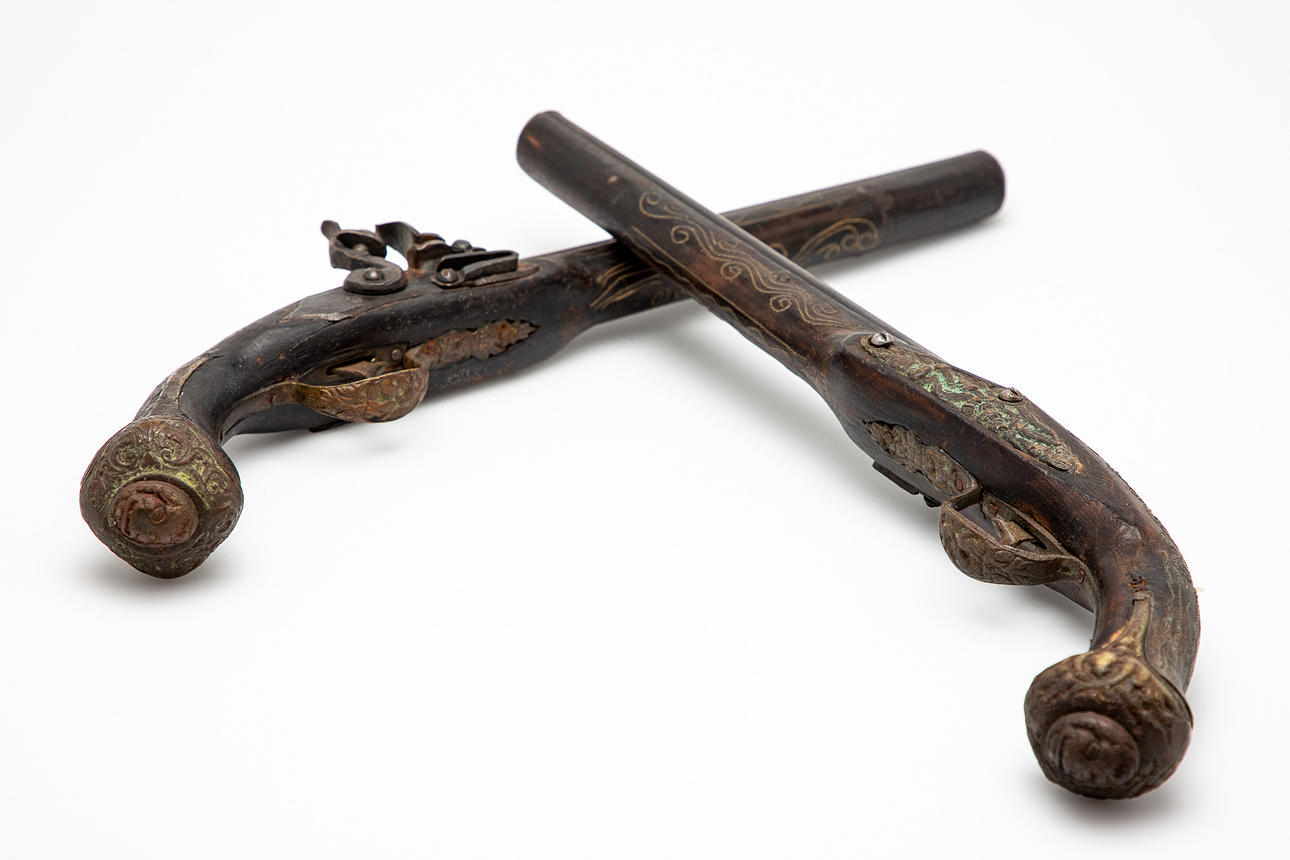 Two muzzleloaders / pistols / flintlock, wood, metal. Pair of muzzle-loading pistols with a round, smooth-walled barrel, flintlock mechanism and a wooden stock with ornamental metal inlays, L.45cm. (2).