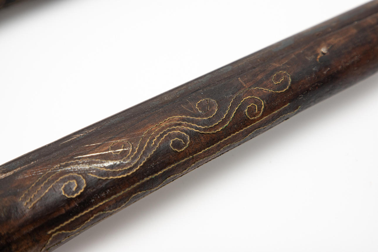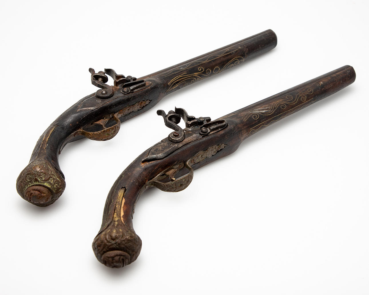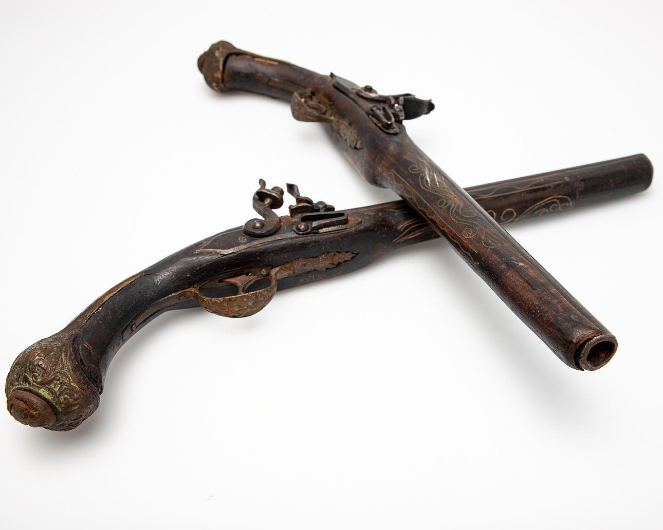 Two muzzleloaders / pistols / flintlock, wood, metal. Pair of muzzle-loading pistols with a round, smooth-walled barrel, flintlock mechanism and a wooden stock with ornamental metal inlays, L.45cm. (2).