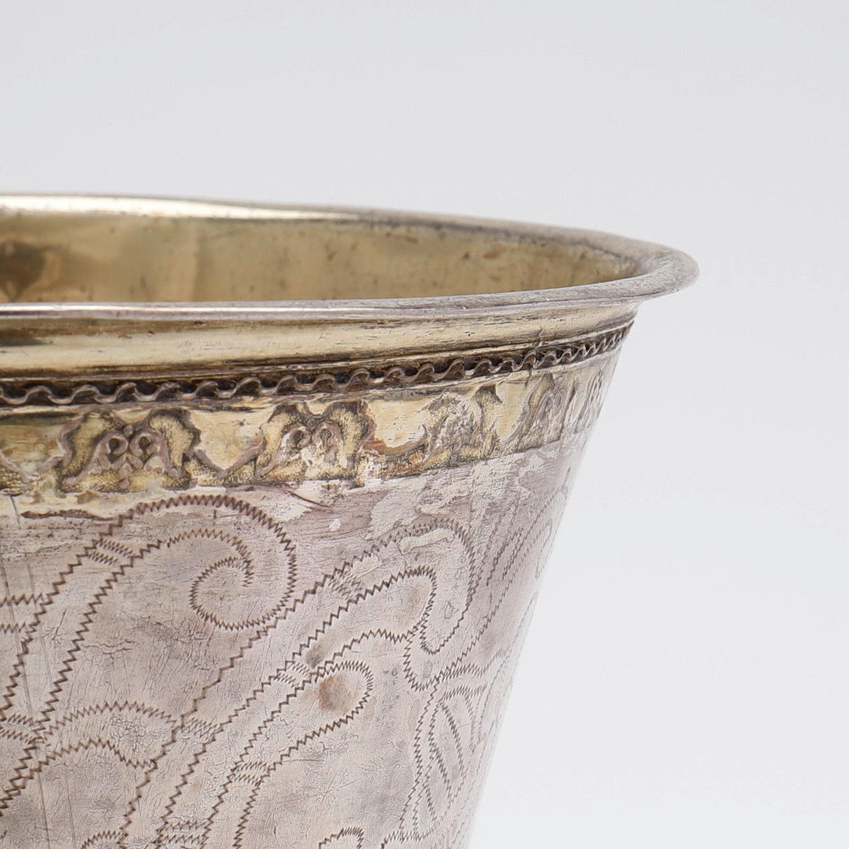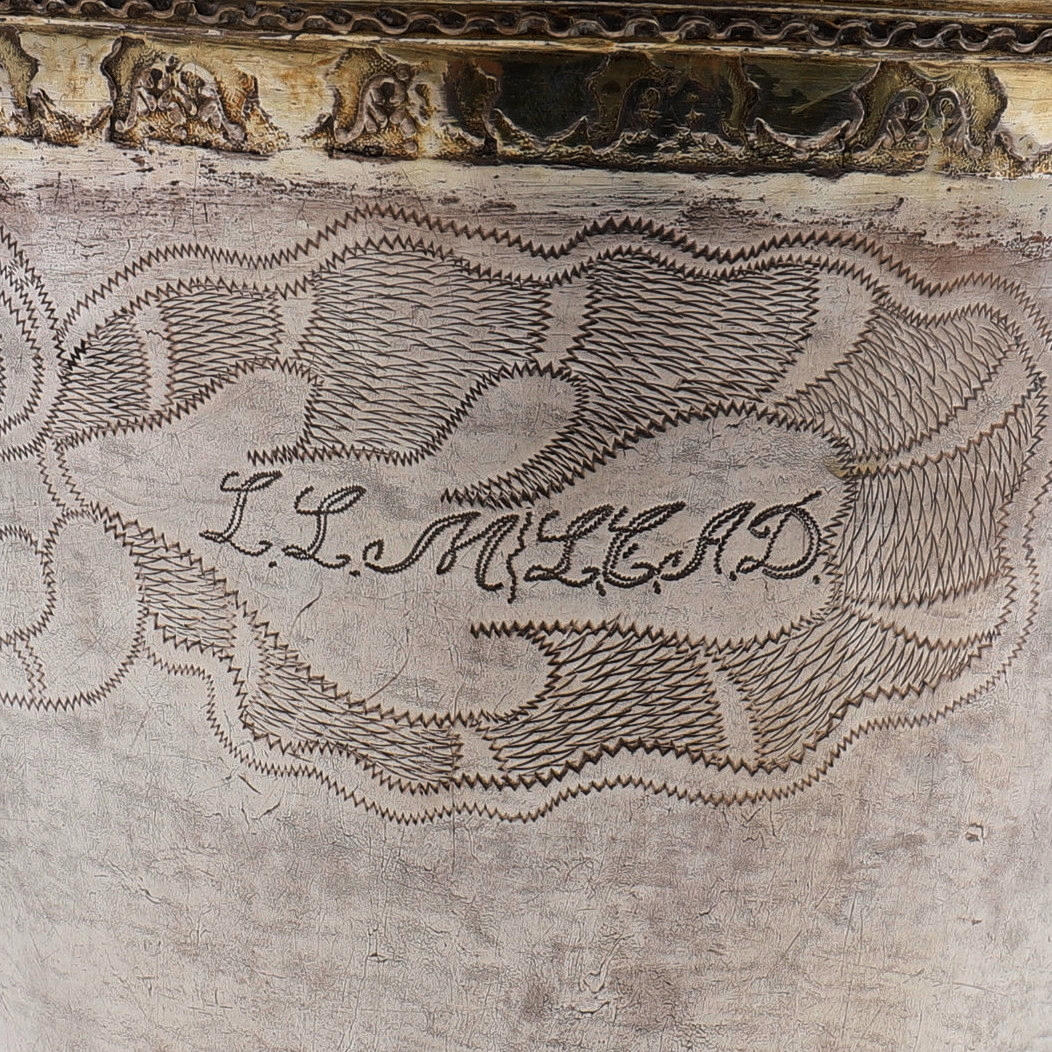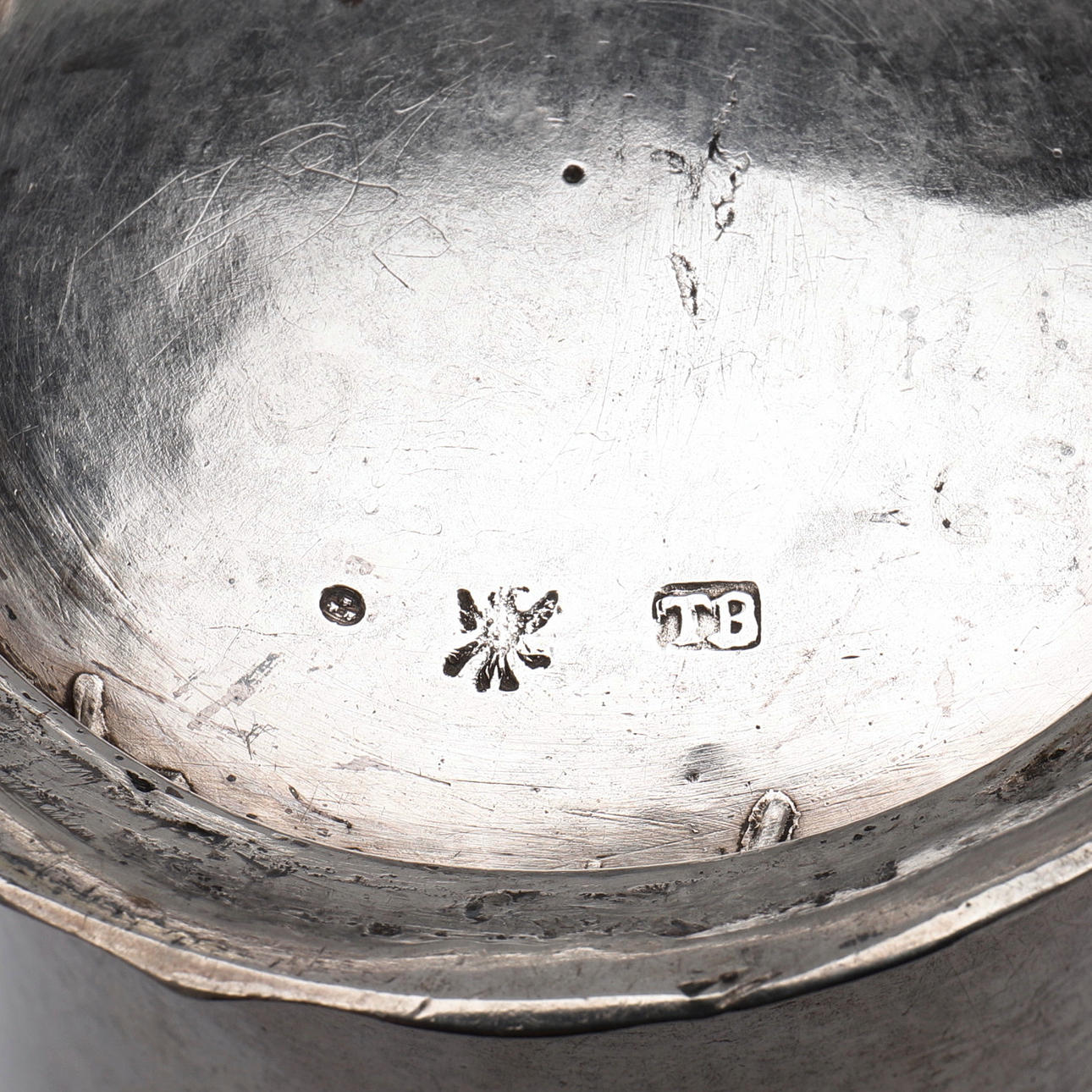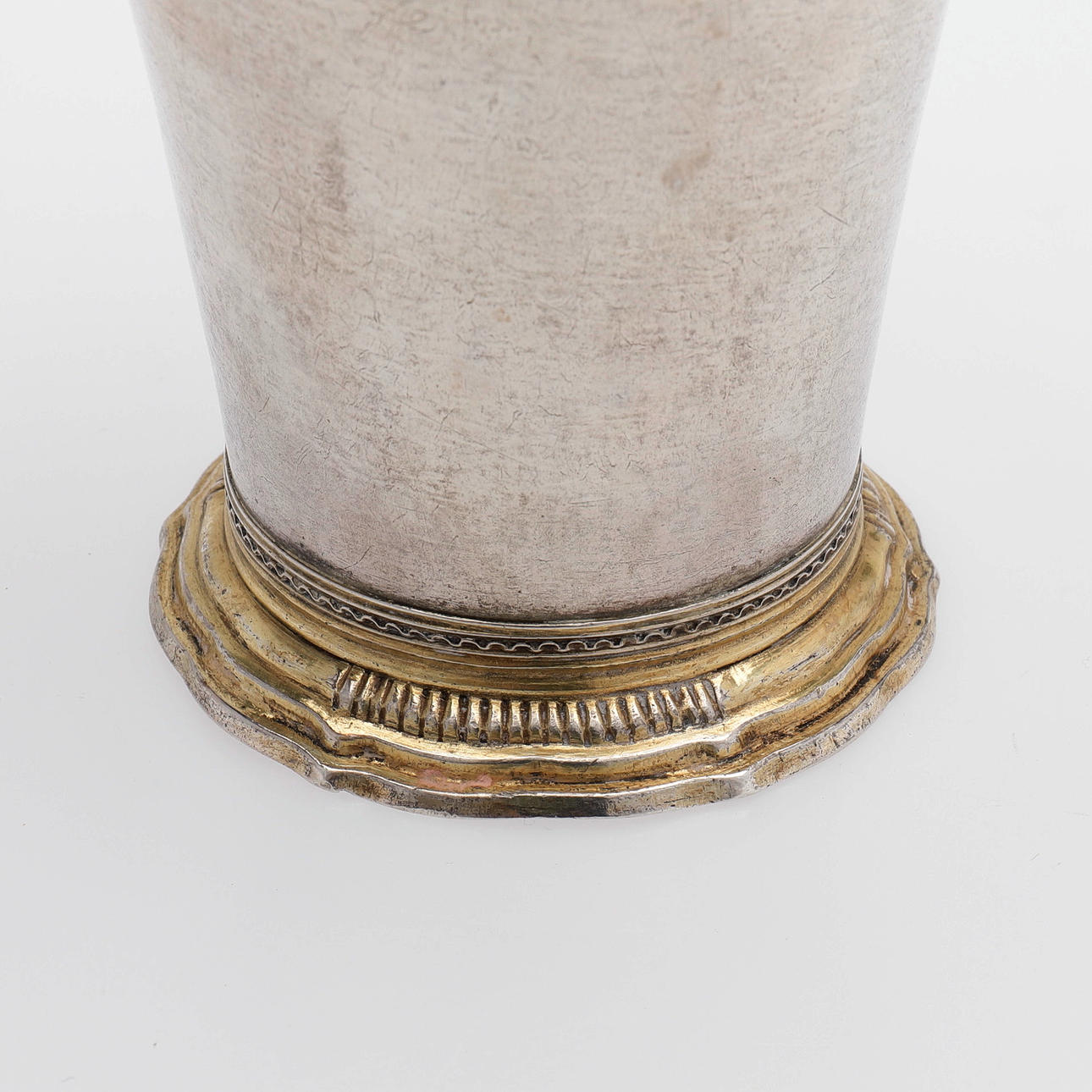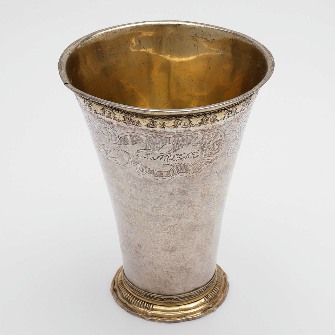 Active 1727-59, the widow ran the workshop until 1772. Inside gilded, outside partially gilded, height 18 cm, weight 346 grams.