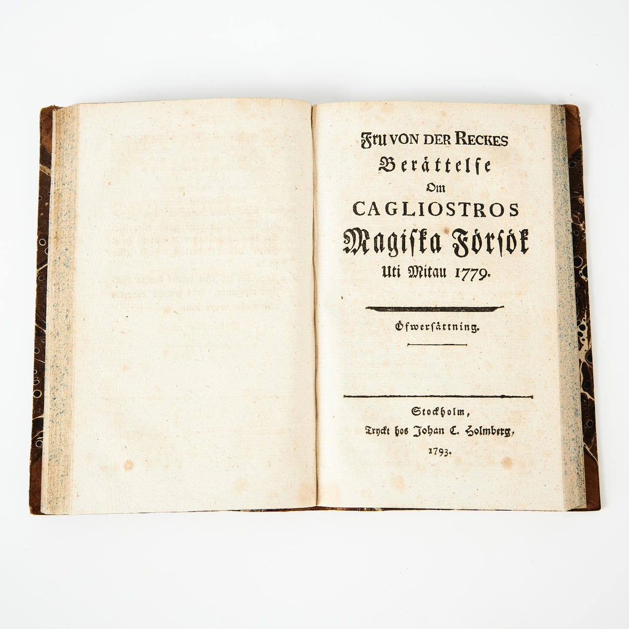 Bound with: (RECKE, CHARLOTTE E. C. von der) Mrs. von der Recke's account of Cagliostro's magical attempts at Mitau in 1779. Overcompensation. Stockholm, J. C. Holmberg, 1793.