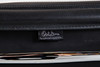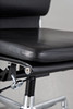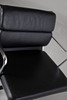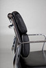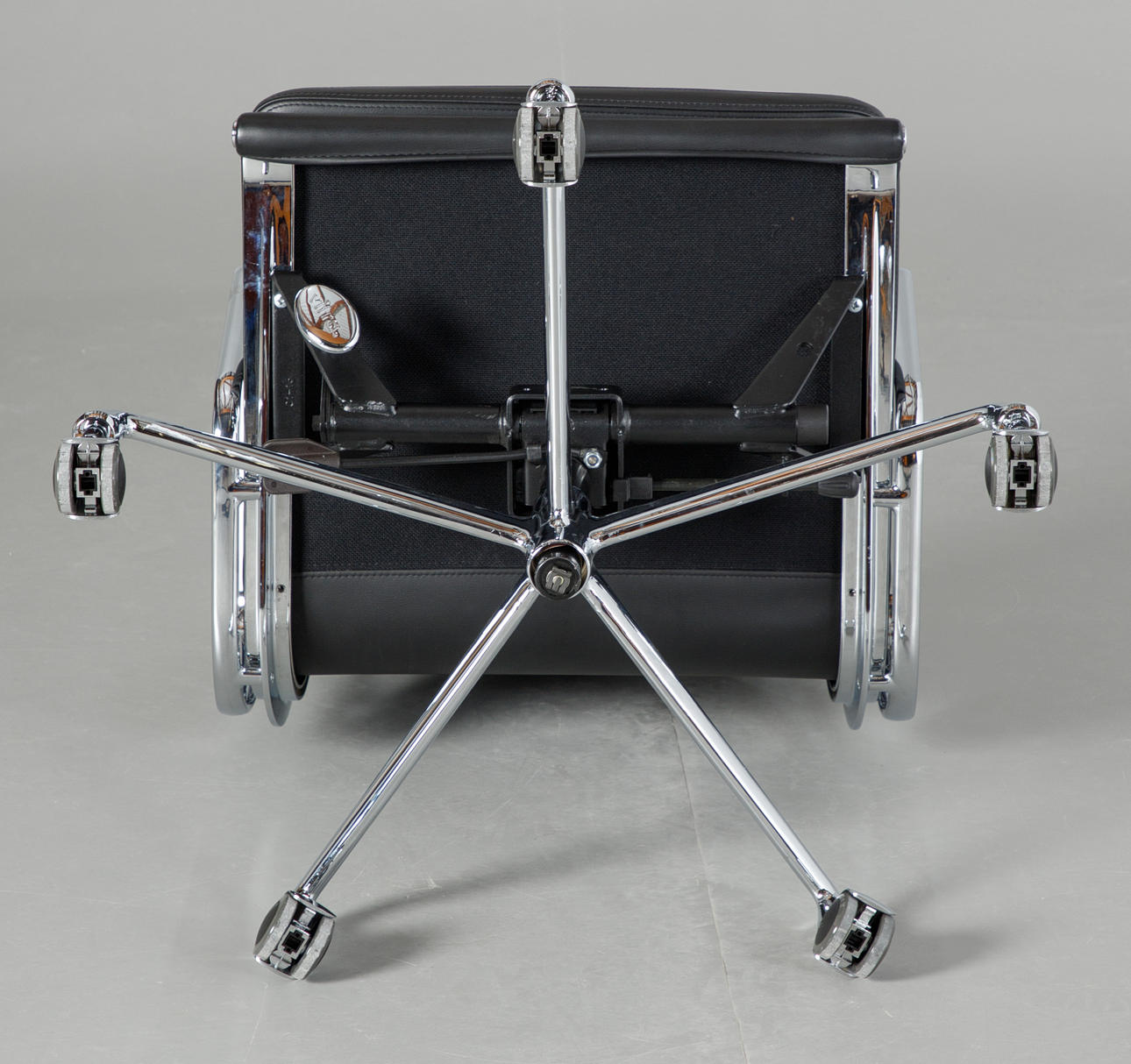 Draft: 1969. Mid-high back. Underframe and armrests, chrome-plated. With rollers and reclining mechanism, height adjustable. Black leather cover. Marked with label, HxWxSh: 84-96x58x40-52cm.