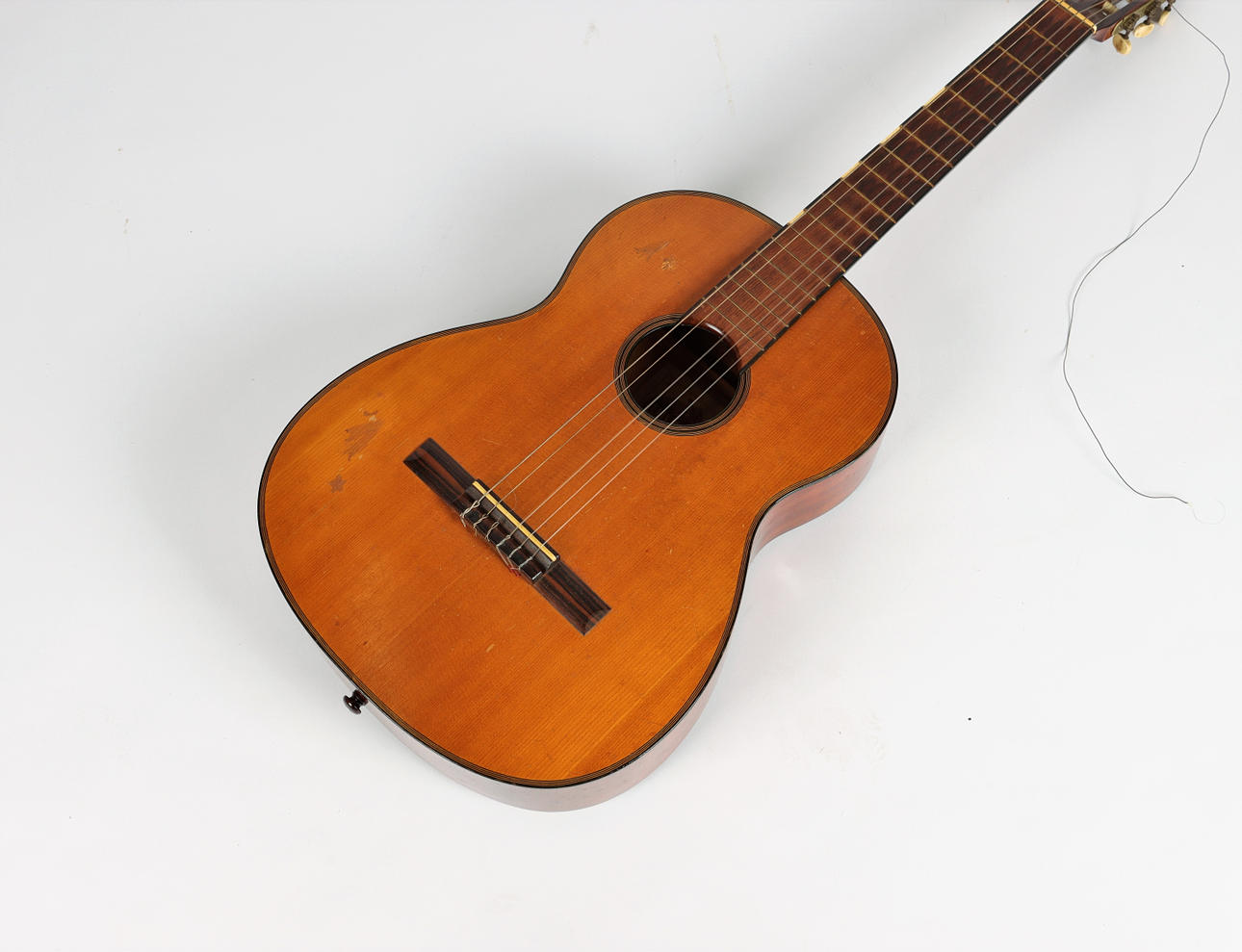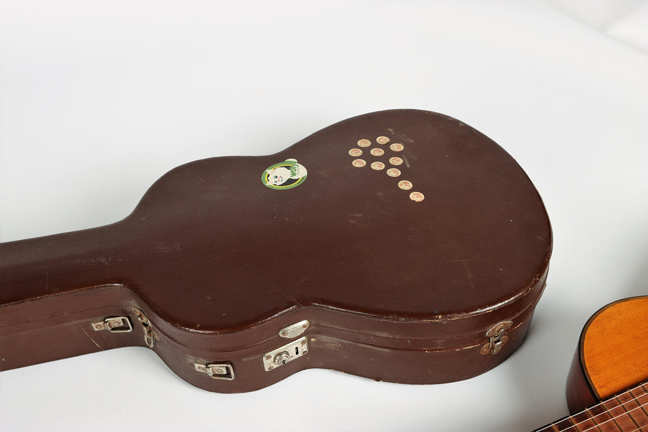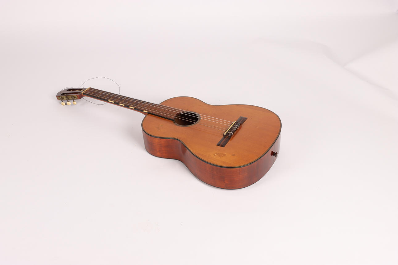 Guitar with original box. Wood with inlays. Chiselings in metal. Marked with label ELIS MARBO Gothenburg 1945 Length 100 cm Width 37 cm.